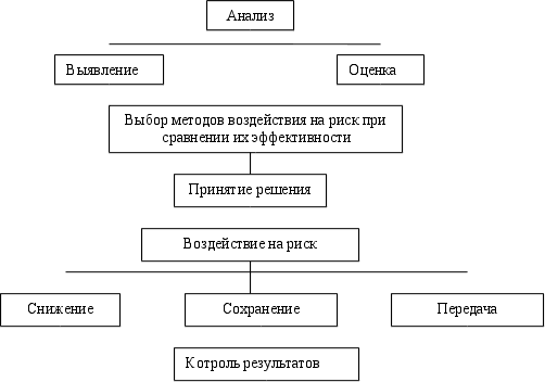 На втором этапе предприниматель должен провести оценку риска. Существуют следующие методы оценки предпринимательского риска:3 - статистический метод оценки - метод экспертных оценок - использования аналогов - комбинированные методы Методы математической статистики. Главные инструменты данного метода оценки – дисперсия, стандартное отклонение, коэффициент вариации. С помощью статистического метода оценки, то есть на основе расчета дисперсии, стандартного отклонения и коэффициента вариации можно оценить риск не только конкретной сделки, но и предпринимательской фирмы в целом (проанализировав динамику ее доходов) за некоторый промежуток времени. Методы экспертных оценок. Экспертный метод может быть реализован путем обработки мнений опытных предпринимателей и специалистов. Желательно, чтобы эксперты сопровождали свои оценки данными о вероятности возникновения различных величин потерь. Можно ограничиться получением экспертных оценок вероятностей допустимого критического риска либо оценить наиболее вероятные потери в данном виде предпринимательской деятельности. Метод аналогий. Метод аналогий используется в том случае если другие методы оценки риска неприемлемы. При использовании аналогов применяются базы данных о риске аналогичных проектов и сделок, исследовательских работ проектно-изыскательских учреждений. Полученный таким образом данные обрабатываются для выявления зависимостей в законченных проектах с целью учета потенциального риска при реализации нового предпринимательского проекта или сделки. Комбинированный метод. Комбинированный метод представляет собой объединений нескольких отдельных методов или их отдельных элементов. Примером может служить оценка предпринимательского риска на основе расчета вероятности нежелательного исхода сделки. В данном случае анализ риска производиться с помощью элементов статистического, экспертного методов, а также метода аналога. Затем наступает этап выбора метода воздействия на риски с целью минимизировать возможный ущерб в будущем. Но так как существует несколько способов его уменьшения, то возникает проблема оценки сравнительной эффективности методов воздействия на риск для выбора наилучшего из них1. После выбора оптимальных способов воздействия на конкретные риски появляется возможность сформулировать общую стратегию управления всем комплексом рисков предприятия. Это этап принятия решения, конда определяются требуемые финансовые и трудовые ресурсы, происходит постановка и распределение задач среди менеджеров, осуществляется анализ рынка соответствующих услуг, проводятся консультации со специалистами. “процессе принятия конкретного решения целесообразно различать и выделять определенные области (зоны риска) в зависимости от уровня возможных (ожидаемых) потерь в финансово-хозяйственной деятельности.” 2 Процесс непосредственного воздействия на риск представлен на рис. 2 тремя способами: снижением, сохранением и передачей риска. Снижение риска подразумевает уменьшение либо размеров возможного ущерба, либо вероятности наступления неблагоприятных событий. Чаще всего оно осуществляется при помощи осуществления предупредительных организационно-технических мероприятий, под которыми понимаются различные способы усиления безопаснос