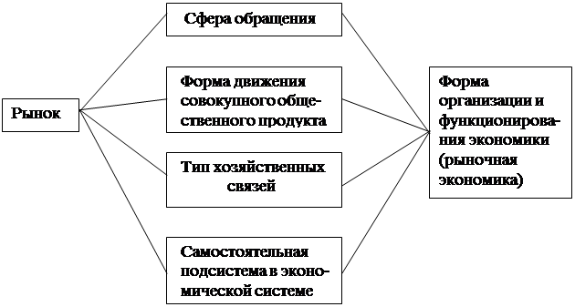 3 - натуральное хозяйство рис.1. Структура экономической системы смешанной экономики Как видно из этой схемы, в экономической системе в целом взаимодействуют три самостоятельные подсистемы, и, в зависимости от того, какая подсистема имеет наибольший удельный вес, характеризуется и вся экономическая система: если преобладает рынок, то система – рыночная, так возникает рыночная экономика; если преобладает государство, то система – административно-командная; если преобладает натуральное хозяйство, то такова и система в целом. Все рассмотренные в этом параграфе определения рынка свидетельствуют о различных ступенях в историческом процессе познания рынка как экономического явления и раскрывают разные грани этого явления (рис.2)
