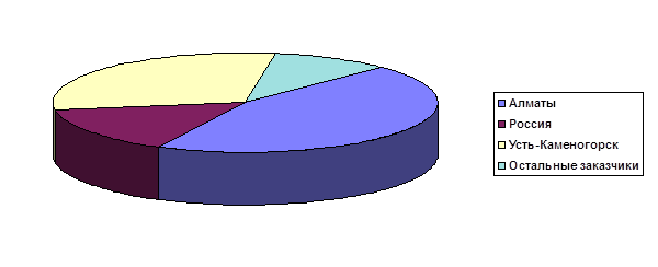 Сбыт выпускаемой продукции на данном предприятии осуществляется следующими способами: 1. Магазины розничной торговли 2. Оптово-торговые организации 3. Посреднические компании 4. Заказы от фирм и организаций 5. Потребителям Основными покупателями выпускаемой продукции является население со средним уровнем достатка. Большая часть продукции реализовывается через РТД “ЗАНГАР”. Также был арендован отдел в магазине “Детский мир” для реализации продукции, производимой для детей. В1993 году произошло расширение рынка сбыта. Был заключен договор с Акционерным Обществом “ЦУМ” города Усть-Каменогорска. По условиям данного договора заказчик оплачивал 100 процентов стоимости приобретаемой продукции с дальнейшим самовывозом с территории города Алматы. Данный договор являлся выгодным, так как наибольшая часть продукции реализовывалась на территории Восточно-Казахстанской области. На территории города Алматы одним основных заказчиков является Алматинкая Радио-Телевизионная Передающая Станция, которая оформила долгосрочный заказ на пошив спецодежды для работников. В 1993 году был заключен договор с Центральным Спортивным Клубом Армии Республики Казахстан на пошив зимних тренировочных костюмов для спортсменов конькобежцев. Одним из заказчиков является Акционерное общество “Ынтымаксервис”, занимающееся предоставлением парикмахерских услуг населению города Алматы, заключившее договор на покупку спецодежды для мастеров парикмахеров. В 1995 году фирма заключила договор с посреднической компанией “Ая”, занимающейся посреднической деятельностью на территории Алтайского края в городе Бийске, на закупку выпускаемой продукции. Согласно условиям договора компания “Ая” оплачивала 100 процентов предоплаты, с последующим самовывозом со склада города Алматы, а также определяла ассортимент и количество единиц каждого наименования закупаемой продукции. Также от компании “Ая” был получен заказ на пошив постельного белья, которое ранее не выпускалось фирмой, что послужило поводом для частичного технического перевооружения фирмы. Последнее время данная компания являлась самым крупным заказчиком для фирмы. Также заключались договора с физическими лицами на покупку выпускаемой продукции для дальнейшей реализации на вещевых рынках города Алматы. Таблица 2.7 Анализ крупнейших покупателей