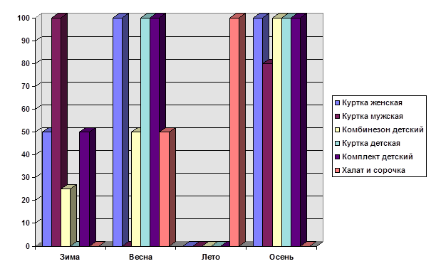 Ассортимент выпускаемой продукции разнообразен. Он включает в себя продукцию как для детей, так и для взрослых. В зимний период фирмой выпускались женские утеплённые куртки из смесовых тканей, мужские зимние куртки ( “Аляска” ) из смесовых тканей на синтепоне, детские куртки и комбинезоны, комплекты детской одежды, включающие в себя куртку и полукомбинезон из плащевых тканей на утеплённой подстёжке. В летний период фирмой выпускались мужские сорочки, женские халаты и ночные сорочки. В последнее время фирмой выпускается постельное бельё. Судя по анализу выпущенной продукции за 1994 год, больше производилось женских курток - 657 единиц, что составляет сорок процентов от общего выпуска изделий. В этом же году фирмой было выпущено 97 единиц мужских курток, что составило 5.9 % от общего выпуска продукции. Выпуск детской продукции, включая детские куртки, комбинезоны и комплекты - 548 единиц, что составило 3.3 % от общего выпуска продукции. Проведя анализ заключенных договоров можно сделать вывод о том, что маркетинговых исследований на предприятии практически не проводилось. Выпуск той или иной продукции зависел от сезонности ( Рис. 2.2 ) и от объёма продаж. Зимой фирма производила больше верхней зимней одежды, а летом летней одежды. Если за 1994 год фирма произвела 1645 изделий летнего и зимнего ассортимента ( Таблица 2.4), то удельный вес зимних изделий составляет 79 %, а летних 21 %. Следует отметить, что летом у работников был один месяц отпуска.