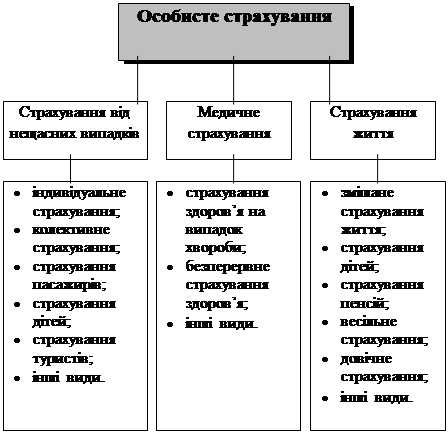 Страхування від нещасних випадків об'єднує короткострокові (як правило, до одного року) види особистого страхування. Обсяг відповідальності за видами, які входять у цю підгалузь, передбачає виплату страхової суми або її частини в разі настання однієї з таких подій: а) смерті застрахованого; б) постійної втрати ним здоров'я (встановлення інвалідності); в) тимчасової непрацездатності. Необхідна умова настання відповідальності страховика — щоб перелічені події були наслідком нещасного випадку, передбаченого в договорі страхування. Страхувальником може бути як фізична, так і юридична особа (наприклад, підприємство, яке страхує своїх працівників), а застрахованим — лише фізична особа. Якщо особа укладає договір страхування власного життя і здоров'я, то вона одночасно є страхувальником і застрахованим. При укладанні договору страхування життя і здоров'я іншої особи (наприклад, дитини) застрахованою буде саме ця особа, а страхувальником — особа, що уклала договір і сплачує внески. Страхування від нещасних випадків в Україні провадиться як у добровільній, так і в обов'язковій формі. Конкретними видами страхування в цій підгалузі є, наприклад, індивідуальне страхування від нещасних випадків, колективне страхування працівників за рахунок коштів підприємств і організацій, страхування туристів, пасажирів, дітей, окремих категорій працівників, чия робота пов'язана з особливою небезпекою для життя і здоров'я, та інші такі види. Вони мають дуже багато спільних рис, і тому законодавством України передбачається можливість здійснення страховиком усіх цих видів страхування за однією ліцензією, а саме: ліцензією на право здійснення страхування від нещасних випадків. Друга підгалузь особистого страхування — медичне страхування. Воно виникло і почало розвиватися в нашій країні порівняно недавно, хоча Західні країни мають уже досить великий досвід у цій справі. За радянських часів потреби в медичному страхуванні начебто й не було, оскільки медична допомога надавалася на безоплатній основі. З переходом до ринкових відносин ситуація змінилася. Висока вартість кваліфікованої медичної допомоги зумовила інтерес населення до медичного страхування, що сприяло його розвитку. Особливістю цієї підгалузі є наявність тут як довгострокових, так і короткострокових видів страхування. До довгострокових видів належить, наприклад, безперервне страхування здоров'я, договір про яке страхувальник може укласти на невизначений період. Проте «довгостроковість» цього виду не дає підстав віднести його до підгалузі страхування життя, оскільки він не передбачає повернення страхувальникові внесених ним коштів по закінченні строку дії договору страхування (тобто при «дожитті», що є характерною ознакою договорів страхування життя). Так само не можна віднести до підгалузі страхування від нещасних випадків короткострокові види медичного страхування (наприклад, страхування здоров'я на випадок хвороби, медичне страхування туристів, що від'їжджають за кордон, страхування на період вагітності та пологів тощо), бо в них відсутній принциповий момент, характерний для всіх видів страхування від нещасних випадків, а саме: нещасний випадок, який характеризується раптовістю. Ще одна особливість медичного страхування — це те, що страхова виплата може здійснювати