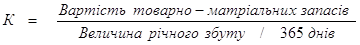 Зрозуміло що для аналізу використання ресурсів підприємства показника обігу основного капіталу замало , бо він не враховує активи , що не входять до його складу . А через те , що питома частка даних активів на багатьох підприємствах дуже значна - доцільно використовувати показник обігу загальної вартості майна ., що дасть можливість побачити ефективність використання майнового комплексу підприємства в цілому. Товарно-матеріальні запаси в днях обороту
