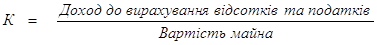 Вимірюється величина доходу який принесла реалізація товару на 1 грошову одиницю . Основний коефіцієнт дохідності