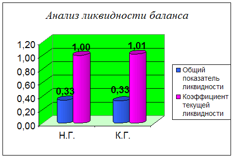 Анализируя таблицу можно сделать вывод, что ликвидность баланса отличается от абсолютной. На данном предприятии наблюдается платежный недостаток наиболее ликвидных активов и быстро реализуемых активов; платежный излишек медленно реализуемых активов как на начало, так и на конец года. Труднореализуемых активов на начало года был излишек, а в конец года недостаток. Сопоставление ликвидных средств и обязательств позволяет вычислить следующие показатели: 1. Текущая ликвидность (ТЛ) свидетельствует о платежеспособности или о неплатежеспособности предприятия на ближайший к рассматриваемому моменту промежуток времени. ТЛ = (А1 + А2) – (П1 + П2) (24) ТЛН.Г = -171241 тыс. руб. ТЛК.Г. =-212726 тыс.руб. Значение показателя текущей ликвидности свидетельствует о неплатежеспособности предприятия на ближайший к рассматриваемому моменту промежуток времени. 2. Перспективная ликвидность (ПЛ) – это прогноз платежеспособности предприятия на основе сравнения будущих поступлений и платежей. ПЛ = А3 – П3 (25) ПЛН.Г. = 170471 тыс.руб. ПЛК.Г. = 216188 тыс.руб. Значение показателя перспективной ликвидности свидетельствует о платежеспособности предприятия на ближайшую перспективу. Анализ ликвидности баланса с помощью абсолютных показателей является в какой-то степени приближенным, так как абсолютные показатели подвержены влиянию инфляции. Более детальным является анализ платежеспособности при помощи финансовых коэффициентов: 1. Общий показатель ликвидности используется для комплексной оценки ликвидности баланса. С помощью данного коэффициента осуществляется оценка изменения финансовой ситуации на предприятии с точки зрения ликвидности. Увеличение данного коэффициента в динамике положительно характеризует деятельность предприятия. Данный коэффициент применяется также при выборе наиболее надежного партнера из множества потенциальных на основе отчетности. К1 = Нормативное значение К1 ≥ 1 2. Коэффициент абсолютной ликвидности (платежеспособности) является наиболее жестким критерием ликвидности предприятия, показывает какая часть краткосрочных заемных средств может быть при необходимости погашена немедленно за счет имеющихся денежных средств. К2 = Нормативного значения данный коэффициент не имеет, но по статистическим данным отечественных предприятий составляет от 0,05 до 0,1. По данным зарубежной статистики он не меньше 0,2. 3. Коэффициент быстрой ликвидности или критической оценки. При вычислении данного коэффициента в числителе принимаются только денежные средства, а товарно-материальные запасы исключаются. К3 = По данным зарубежной статистики К3 ≥ 1, при этом чрезмерное значение коэффициента быстрой ликвидности может быть результатом неоправданного роста дебиторской задолженности. 4. Коэффициент текущей ликвидности. Дает общую оценку ликвидности предприятия, показывая сколько рублей оборотных средств (текущих активов) приходится на 1 рубль текущей краткосрочной задолженности (текущих обязательств). Значение данного коэффициента может значительно меняется по отраслям и видам деятельности, его разумный рост в динамике рассматривается как благоприятная тенденция. К4 = В западной учетно-аналитической практике нижнее критическое значение данного коэффициента принимается равным 2. По данным отечественной статистики оптимальное значение К4 ≥ 1 (норм