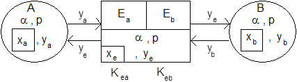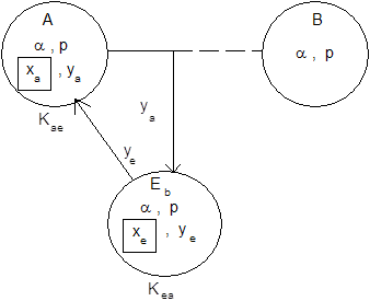 Рис.2 Атака 2. Еа, Еb - противник Е, играющий роли пользователей А и В, перехватывает сообщения от А и В, формирует ключи Kae и Keb парной связи с А и В путем ведения двух параллельных протоколов. В результате пользователи А и В считают, что они имеют конфиденциальную связь на ключе Kab; в действительности они установили шифрованную связь с перешифрованием у противника Е. (Рис.3).