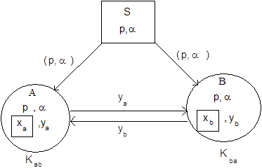 по достоверному каналу системные константы (Р, Протокол ключевого обмена DHПользователи А и В формируют секретный ключ парной связи Kab с помощью следующего протокола (Рис.1) -