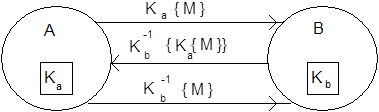 Рис.6 Формальная запись протокола: A: В: ДСЧ (В) A: (М B: (M Атака 1. Противник Е перехватывает все три сообщения в канале связи и складывает их по mod2. В результате получается М в открытом виде. Атака 2. Пользуясь отсутствием идентификации корреспондентов А и В, противник Е может сыграть роль В, разрушая конфиденциальность М, или сыграть роль А, навязывая ложное сообщение пользователю В. Трехшаговый протокол с коммутативным шифрованиемВ общем случае трехшаговый протокол шифрования Шамира имеет следующую формальную запись (Рис.7): А: Ka { M } B: A: B: