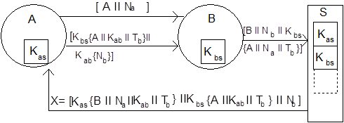 и формирует с А ключ Протокол Нейман - СтаблбайнСловесное описание протокола: - Пользователь А передает В свой нонс Na в открытом виде. - Пользователь В шифрует на ключе Kbs нонс Na, свою отметку времени Тb и посылает серверу S вместе со своим нонсом Nb, который вернется к В от А в шифрованном виде на ключе Kab и будет проверен. - Сервер S генерирует ключ Kab, шифрует его для А и В, но оба шифрованных сообщения отправляются к А с открытым нонсом Nb. - Пользователь А выделяет соответствующую часть для В и посылает В вместе с Kab{Nb}, для проверки “свежести” полученного ключа Kab (Рис.9).