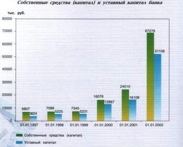 Выбрав стратегию роста, банк проводит целенаправленную работу по постоянному наращиванию собственных средств (капитала) банка, который в 2001 году был увеличен до 67276 тыс. руб., или в 2,8 раза. За последние 5 лет этот рост составил в 10 раз. В 2001 году был осуществлен 4 выпуск обыкновенных акций на сумму 35 млн. руб., основными покупателями которых стали крупнейшие промышленные предприятия Мордовии. В результате чего уставный капитал банка составил 51108 тыс. руб., или увеличился в 3,2 раза. В целях укрепления устойчивости банка и обеспечения интересов клиентов постоянно наращивается резервный фонд банка, который на 01.01.2002 г. составил 4 млн. руб., т.е. увеличен за год в 1,8 раза.