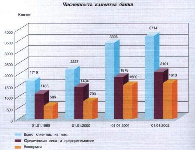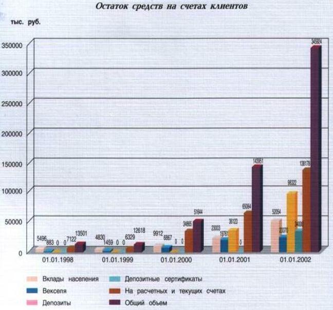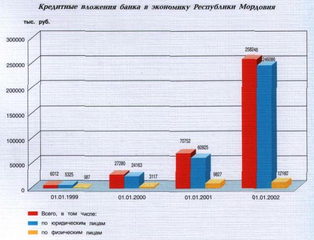 Умелое сочетание проверенных временем и активное внедрение качественно новых банковских услуг стали основой дальнейшего развития банка, роста уверенности в банке его акционеров и клиентов. Правильность выбранных банком стратегии и тактики деятельности в области денежно-кредитных отношений подтверждают достигнутые им в 2001 году успешные результаты в условиях развивающихся, а порой противоречивых рыночных реформ, осуществляемых в экономике России и Мордовии. Валюта баланса банка на конец 2001 года составила 451 млн. руб., т.е. возросла в сравнении с началом года в 2,4 раза.