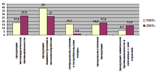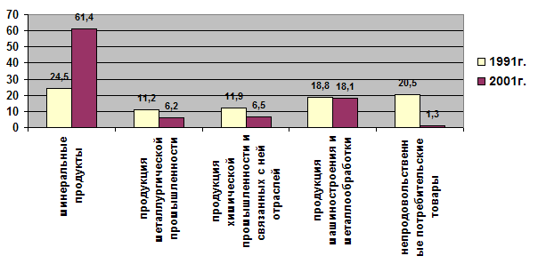 Рис. 2.1. Часть отдельных товарных групп в экспорте РФ в Украину в 1991г. и 2001г.