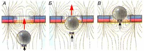 Рис. 2. а – гайка примагнитилась к поверхности шара, лежащей ниже второй особой точки; б – гайка отваливается от поверхности шара попавшей в окрестность особой точки; в – гайка вновь примагнитилась к шару над особой точкой Он поднес снизу к ферритовому кольцу стальной шарик, а к его нижней части металлическую гайку. Она тут же притянулась к нему (рис. 2а). Здесь все понятно – шарик, попав в магнитное поле кольца, стал магнитом. Далее исследователь стал вносить шарик снизу вверх в кольцо. И вдруг – гайка отвалилась и упала на стол (рис. 2б). Вот она, нижняя особая точка! В ней изменилось направление поля, шарик стал перемагничиваться и оттолкнул от себя гайку. Подняв шарик выше особой точки, гайку вновь можно примагнитить к нему (рис. 2в). У Острикова поставлен с десяток опытов, подтверждающих наличие магнитного балджа. А что проку в нем? – возникает естественный вопрос. Остриков зажал как-то ферритовое кольцо в патрон токарного станка и поместил в магнитный балдж три маленьких металлических шарика. Когда патрон завращался, они отделились от внутренней части кольца (к которой прилеплялись в покое) и закружились каждый по своей орбите, не вываливаясь из магнитной ловушки. Михаил Федорович не спешит с прогнозами, но и не отвергает того, что балдж может оказаться идеальной «посудиной» для высокотемпературной плазмы. А ее, как известно, ученые уже не одно десятилетие пытаются удержать в устройствах типа Токамак, дабы осуществить термоядерный синтез. Зная о балдже, можно создать и более прозаические конструкции – бесконтактные подшипники, центрифуги, амортизаторы и многое другое. Но самым глобальным следствием обнаруженного явления может оказаться пересмотр модели мироздания. Кружащие по своим орбитам шарики натолкнули Острикова на мысль, что и наша Земля движется под действием магнитных сил внутри вращающегося звездного кольца – Млечного Пути. Кто знает, возможно, открыв магнитную картину Вселенной, мы создадим новые способы перемещения в ней, и тогда балдж будет преподаваться в школьном курсе физики заодно с конструкцией МЛО – магнитных летающих объектов? Список литературы Для подготовки данной работы были использованы материалы с сайта http://www.n-t.org |