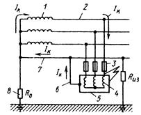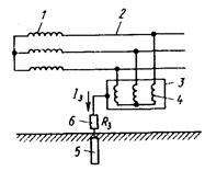 Рис. 1. Схема защитного заземления в сети с изолированной нейтралью: 1— трансформатор; 2 — сеть; 3 — корпус токоприемника; 4— обмотка электродвигателя; 5—заземлитель; 6—сопротивление заземления (условно) При пробое изоляции токоведущих частей на корпус, изолированный от земли, он оказывается под фазовым напряжением Uф. При наличии заземления вследствие стекания тока на землю напряжение прикосновения уменьшается и, следовательно, ток, проходящий через человека, оказывается меньше, чем в незаземленной установке. Чтобы напряжение на заземленном корпусе оборудования было минимальным, ограничивают сопротивление заземления. В установках 380/220 В она должна быть не более 4 Ом, в установках 220/127 В—не более 8 Ом. Если мощность источника питания не превышает 100 кВА, сопротивление заземления может быть в пределах 10 Ом. В качестве заземляющих устройств электроустановок в первую очередь должны быть использованы естественные заземлители. Возможно применение железобетонных фундаментов промышленных зданий и сооружений. При отсутствии естественных заземлителей допускается применение переносных заземлителей, например ввинчиваемых в землю стальных труб, стержней, уголков. После заглубления в землю они должны иметь концы длиной 100...200 мм над поверхностью земли, к которым привариваются соединительные проводники. Категорически запрещается использовать в качестве заземлителей трубопроводы с горючими жидкостями и газами.