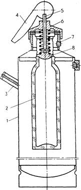 1- корпус; 2- стакан с кислотной частью заряда; 3-ручка; 4- рукоятка; 5- шток; 6- крышка; 7- спрыск; 8- клапан. Рисунок 1 — Химический пенный огнетушитель ОХП -10 Таблица 1 - Технические характеристики химических пенных огнетушителей