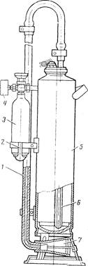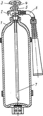 1- баллон; 2- предохранитель; 3- маховичок вентиля-заопра; 4- металлическая пломба; 5- вентиль; 6- поворотный механизм с раструбом; 7- сифонная трубка. Рисунок 3 - Углекислотный огнетушитель ОУ – 5 Углекислотные огнетушители (ОУ-2, ОУ-5, ОУ-8) предназначены для тушения загораний различных веществ и материалов, за исключением веществ, которые могут гореть без доступа воздуха, загораний на электрофицированном железнодорожном и городском транспорте, электроустановок под напряжением до 380 В. Температурный режим хранения и применения углекислотных огнетушителей от минус 40 °С до плюс 50 °С. Углекислотно-бромэтиловые огнетушители ОУБ-3А и ОУБ-7А представляют собой стальные тонкостенные баллоны (толщина стенки 1,5-2 мм) сварной конструкции. В горловину баллона ввернута запорная головка рычажного типа с распыляющей насадкой и сифонной трубкой. Емкость баллонов соответственно 3,2 и 7,4 л. Огнетушащим зарядом является состав 4НД (97 % бромэтила и 3 % углекислого газа). Огнегасительное действие бромистого этила основано на торможении химических реакций горения, поэтому его часто называют антикатализатором или ингибитором. Для выброса заряда в огнетушитель закачивают воздух под давлением 0,9 МПа. Время действия огнетушителей 20-30 с при длине струи 3-4 м. Огнетушители этого типа предназначены для тушения небольших загораний различных горючих веществ, тлеющих материалов, а также электроустановок, находящихся под напряжением до 380 В. Их используют в складских помещениях, на грузовых и специализированных автомобилях, на бензораздаточных колонках и т.д. Огнетушители могут быть применены при температуре окружающего воздуха от минус 60 °С до плюс 60 °С. Огнегасительный эффект этих огнетушителей в 14 раз выше, чем углекислотных. Огнетушители аэрозольные (хладоновые) используют в тех же случаях, что и угдекислотно-бромэтиловые. Огнетушащий состав хладон (фреон), 114В2, 13В1 в процессе пожаротушения не оказывает воздействия на защищаемые материалы и оборудование, что позволяет использовать данные огнетушители при тушении пожаров электронного оборудования, картин и музейных экспонатов. Наша промышленность выпускает огнетушители марок ОАХ, ОХ-3 и др. 3.4 Огнетушители порошковые Для тушения небольших очагов загораний горючих жидкостей, газов, электроустановок напряжением до 1000 В, металлов и их сплавов используются порошковые огнетушители ОП-1, ОП-25, ОП-10. Порошковый огнетушитель ОП-1 «Спутник» емкостью 1 л используется при тушении небольших загораний на автомобилях и сельскохозяйственных машинах. Состоит из корпуса, сетки и крышки, изготовленных из полиэтилена. Заполнен составом ПСБ (порошок сухой бикарбонатный), состоящий из 88 % бикарбоната натрия с добавлением 10 % талька марки ТКВ, стеаратов металлов (железа, алюминия, магния кальция, цинка) – 9 %. Во время пользования снимают крышку огнетушителя и через сетку порошок ПСБ вручную распыливают на очаг горения. Образующееся устойчивое порошковое облако изолирует кислород воздуха и ингибирует горение. Порошковый огнетушитель ОП-10 (рисунок 4) содержит в тонкостенном десятилитровом баллоне порошок ПС-1 (углекислый натрий с добавками). Подается с помощью сжатого газа (азот, диоксид углерода, воздух), хранящегося в дополнительном баллончике емкостью 0,7 л под давлением 15 МПа. Применяется для тушения загораний щелочных металло