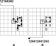 Первый символ запишем в некоторую, заранее заданную клетку. Затем, в зависимости от того, какой именно символ вписан в текущую клетку, следующий элемент последовательности будем заносить в одну из четырех ячеек, соседних с данной. Если в текущую клетку вписана единица, следующий символ разместим в правой соседней клетке; если в текущую клетку вписана двойка, следующий символ разместим в соседней верхней клетке; если в клетку вписана тройка, то следующий символ разместим в соседней левой клетке; и, наконец, если в текущую клетку вписана четверка, то следующий символ впишем в соседнюю нижнюю клетку. Точно так же поступим со следующим символом, и будем продолжать этот процесс, пока не дойдем до нуля (признака окончания последовательности) или не наткнемся на конец поля. Если в процессе записи очередная клетка окажется уже занята, то будем писать наверх, "забивая" предыдущий знак. Информационные макромолекулы РНК и ДНК, как и любые другие полимерные молекулы, в реальных физических условиях имеют определенную пространственную форму, которая во многом определяется порядком следования мономеров в первичной информационной цепочке. Описанный выше алгоритм записи одномерной последовательности знаков на клеточное поле будем считать некой очень общей аллегорией процесса образования пространственной структуры информационной полимерной молекулы. На следующем этапе нашей алгоритмической игры смоделируем процесс копирования исходного информационного кода. Но в качестве матрицы будем использовать не первичную линейную последовательность символов, а ее вторичную "пространственную" структуру, размещенную на клеточном поле. В природе копирование информационных биополимеров осуществляется специализированным ферментом. Особым образом организованная белковая молекула прикрепляется к молекулярным цепочкам ДНК или РНК в точке, отмеченной специальным кодом инициации, и символ за символом синтезирует ее копию. При этом если, например, на исходной матричной молекуле какой-то ее участок свернут в петлю, то существует шанс, что копирующий фермент проскочит это место или, напротив, "зациклится" и повторит его несколько раз. То есть, в принципе, вторичная пространственная структура молекул ДНК или РНК может активно влиять на содержание их дочерних копий. Так, например, "комплементарные палиндромы, способные к образованию вторичной структуры ДНК, пригодны быть горячими точками множественных и одиночных мутаций, делеций и вставок... Наиболее существенно, что комплементарные палиндромы и инвертированные повторы способны обеспечивать блочные перестройки в ходе эволюции генов"1. Иными словами, чем сложнее и причудливей будет закручена исходная молекула, тем больше вероятность различных "курьезов" в процессе ее воспроизведения. К чему все это в совокупности может привести, попытаемся разобраться, продолжив нашу алгоритмическую аллегорию. Копирования информационной матрицы будем моделировать следующим образом. Пусть вначале, по аналогии с природным процессом репликации, воображаемый фермент или считывающая головка "садится" на помеченную ячейку клеточного поля, в которой всегда располагается первый символ. После этого в первую позицию дочерней воспроизводимой последовательности поместим символ, находящийся в этой исходной помече
