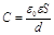 т.е. емкостью конденсатора называется физическая величина равная отношению заряда конденсатора к разности потенциалов между его обкладками. Емкость конденсатора не зависит от величины заряда и разности потенциалов между его обкладками и определяется только размерами и формой обкладок конденсатора, а также диэлектрическими свойствами вещества, заполняющего его. Емкость конденсатора, как и ёмкость проводника, измеряется в фарадах (Ф): 1 Ф — это ёмкость такого конденсатора, при сообщении которому заряда в 1 Кл , разность потенциалов между его обкладками изменяется на 1 В. 2.Емкость плоского конденсатора. Рассмотрим плоский конденсатор, заполненный однородным изотропным диэлектриком с диэлектрической проницаемостью e, у которого площадь каждой обкладки S и расстояние между ними d. Емкость такого конденсатора находится по формуле: