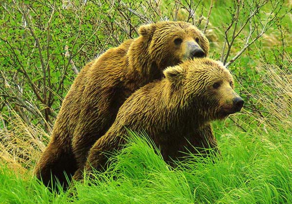 Гималайский медведь. Места обитания этого медведя простираются далеко на север, в Тибет и Гималаи, но он встречается в Японии, на Тайване и гораздо южнее - в Бангладеш и Лаосе. Его также называют Тибетский или Гималайский черный медведь, а то и лунный медведь. Последнее связано с белой или слонового цвета отметкой на груди в виде полукруга или шеврона (порой она слабо выражена или отсутствует вообще). Его можно было бы называть и лохматым медведем из-за длинного меха на плечах и шее, образующего торчащую по сторонам гриву. У азиатского черного медведя широко посаженные уши и широкое кольцо из длинной шерсти на шее и плечах. Он обладает опасным раздражительным нравом, особенно если его потревожат в берлоге. Злобный в дикой среде обитания, он легко поддается дрессировке в неволе с детства. Его можно часто видеть в цирках. У этого животного длинная косматая шерсть черного цвета, местами с красновато-коричневым или желтовато-коричневым оттенком, по плечам и вокруг шеи кольцо из шерсти. Обычно на груди белый или желтоватый шеврон или пятно в форме U. Морда, покрытая редкой шерстью, беловатая или серая, слегка цилиндрической формы. Гималайский медведь*, которого в народе называют то белогрудым, то черным, распространен только в южной части Дальнего Востока, обитая в широколиственных лесах. Они заметно отличаются от бурых медведей. Меховой покров у них шелковистый, черный с белым пятном на груди в виде летящей птицы. Крупные самцы в 200 кг встречаются редко, а самки обычно весят не более 100 кг. Около 15% времени своей жизни гималайские медведи проводят среди крон деревьев, питаясь ягодами, желудями и орехами. На зиму они ложатся в середине ноября, до снега. Берлоги устраиваются в дуплах мягких древесных пород - тополя или липы. Там же у самок в феврале родятся два, реже три слепых медвежонка, всего в 500 граммов весом. Вид включен в Красную книгу России. Однако в настоящий период процесс сокращения численности этого вида остановлен и количество медведей в Приморье уже понемногу увеличивается. Черный медведь в 350 фунтов (157 кг) может показаться удивительно маленьким с далекого расстояния. Даже гризли, который весит в два раза больше, издали тоже кажется намного меньше. Впервые увидев медведя в дикой природе, люди зачастую бывают удивлены тем, что он намного меньше размером, чем они ожидали. Это впечатление создается за счет того, что у медведей тело круглое, они приземистые, а ноги короткие. Более того, толщина ног увеличивает иллюзию приземистости. Тот же медведь весом в 350 фунтов выглядит значительно выше любого человека среднего роста, когда встает на задние лапы, принюхиваясь к запахам или прислушиваясь и осматривая место. Говорят, что медведи близорукие, так как они будто бы не обращают внимания на неподвижные предметы или существа, если только те не оказываются в непосредственной близости. Медведи же больше полагаются на запахи и звуки, чем на зрение. Однако любой, кому приходилось сталкиваться с ними, сразу же вспомнит, да и эксперименты доказали, что у медведей очень острое зрение и ничто не ускользает от их слуха и органов обоняния. Азиатского черного, или гималайского, медведя справедливо опасаются во всех местах его обитания. Это животное отличается раздражительным нравом не только тогда, когда охраняет своих детенышей или пищу, но и ког