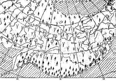 Рис. 1. Природная зональность в Берингии и прилегающих районах около 3 млн. лет назад: 1 – темнохвойная тайга с альпийским поясом в горах, 2 – саванноидные ландшафты, 3 – лесотундра, 4 – тундра, 5 – степь и тайга, выше которой расположен пояс гольцов, 7 – море, 8 – листопадные леса Шельфы были покрыты разреженными лесами из ели, лиственницы, березы, которые к северу сменялись лесотундрой, а близ побережья – тундрой. Это была уже Арктика в самом начале своего становления (около 3 млн лет назад). Она возникла на месте тайги, уничтоженной растущим похолоданием, особенно над Арктическим океаном, который, однако, еще не покрывали постоянные льды. Начальную флору Арктики составляли виды, прежде обитавшие в тайге: багульник (Ledum palustre), голубика (Vaccinium uliginosum), брусника (V.vitis-idaea) и т.п. К ним вскоре добавились виды, возникшие в гольцах: дриада (Dryas punctata), кассиопея (Cassiope tetragona), оксирия (Oxyria dygina), лезлерия (Loiseleuria procumbens) и др. Эти виды легко расселяются вдоль рек, поэтому, хотя они и произошли южнее, в горах, оказаться на севере для них не представляло трудности, поскольку и тогда многие реки текли в Арктический бассейн. На затопленном теперь шельфе еще можно проследить их прежние долины. Многолетних льдов в Арктическом бассейне в это время еще не было, хотя в южных горах уже образовывались ледники. Их следы существуют на Тянь-Шане, Памире, Алтае и в других горных системах. Близ горных ледников и возникли многие виды растений, которым позднее суждено было мигрировать на север, пополнив флору Арктики. В этом же направлении, не торопясь, продвигались из Центральной Азии животные. Среди них выделялись слоны, которые стали символом ледниковой эпохи, одевшись шерстью и «превратившись» в мамонтов. Здесь нужно сделать оговорку. Магнитное поле Земли приобрело современный вид (с полюсом в Канадском Арктическом архипелаге) около 700 тыс. лет назад. А если бы мы вытащили из кармана компас, блуждая в плиоценовой тайге, то его стрелка указала бы нам строго противоположное направление. Палеомагнитный способ стал решающим в определении раздела плиоцена и ледниковой эпохи – плейстоцена. Определяя направление молекулярных «магнитиков» в горных породах, ученые могут сказать, раньше или позднее 700 тыс. лет назад образовывался тот или иной слой вместе с запечатленной в нем характерной растительностью. В цепи событий прошлого, породивших Арктику и оказывавших дальнейшие воздействия на нее, пока еще существуют туманные звенья. Так, нет уверенности в том, что около 700 тыс. лет назад море залило, наконец, северные шельфы суши. Однако, если это случилось и немного позднее, для судьбы Арктики это особого значения не имело. На фоне растущего похолодания, чему способствовало наступление моря на сушу, северные леса деградировали, их место занимали арктические ландшафты, все более смещавшиеся к югу. Существенным фактором было превращение Северного океана в Ледовитый, т.е. льды на нем стали сохраняться и летом. Теперь океан действовал как постоянный холодильник. Насыщенная водяными парами атмосфера обусловила образование мощных материковых покровов льда, прежде всего в горах, откуда ледники растекались на равнины. Главной причиной роста льдов были низкие температуры в летний период. Похолодания чередовались с потеплениями. За 700 тыс. лет произошло четыре цикла похолодания–потеплен