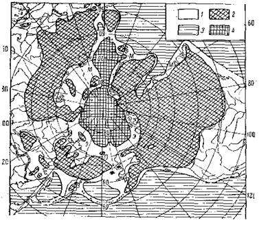 Рис. 2. Палеогеография северного полушария Земли в период максимального оледенения: 1 - суша, 2 – материковые льды, 3 – море, 4 – паковые льды, Э – Эоарктика, М – Мезоарктика В период самого большого оледенения южнее арктического сухопутного круга, т.е. на постоянной суше, северные части материков были покрыты ледовыми щитами до 3 км мощностью. Они занимали громадные площади, в частности всю Канаду (рис. 2). Имелся лишь один обширный проход между ледников – междуречье Енисей–Лена. Ледовые щиты окружала так называемая перигляциальная зона с изреженным растительным покровом из холодоустойчивых мелких растений. По выпуклым элементам перигляциальная зона простиралась на юг до Тибета, сплошь покрытого льдами. Однако на юге Сибири и в Монголии по долинам рек и в других понижениях рельефа в удалении от гор сохранялась лесная растительность. В Средней Азии она даже процветала, а на Дальнем Востоке пострадала меньше, чем в Сибири. В южных горных системах Азии, вплоть до Гималаев, достигших высоты 6 км и более, формировалось собственное оледенение, и альпийский пояс опускался до подножий гор, стыкуясь с перигляциальной зоной. Сформировавшиеся в высокогорьях виды растений получали возможность распространяться к северу по равнинам в тех экологических условиях, к которым они были приспособлены. Потом приходило тепло. Таяли ледники. Лесная растительность выходила из своих убежищ и быстро занимала равнины. Возникшие в горах виды вновь отступали в высокогорья и обосновывались там до следующего похолодания. Море затопляло и шельфы, и арктические ландшафты оставались лишь на островах да вдоль северных окраин суши. Но их флора успевала несколько обогатиться за счет тех высокогорных видов, которые успели за время похолодания достичь этих территорий. Начинался новый этап похолодания, и все повторялось: ледники росли, леса исчезали, шельфы осушались, высокогорные обитатели спускались с гор и расселялись по перигляциальным ландшафтам, продвигаясь к арктическому кругу суши, а также на юг, к Гималаям, Кавказу и другим горным странам. Выходя на пространства осушенных шельфов, многие виды преобразовались из-за суровости условий в новые, отличающиеся от родительских прежде всего миниатюризацией всех частей растения. Миграция новых видов, достигших Арктики по междуречью Енисей–Лена, вдоль северной окраины суши также происходила периодически и преимущественно на восток, поскольку на западе существовал ледяной барьер Северной Земли, который продолжался на материке смыкающимися ледниковыми куполами гор Бырранга и плато Путорана. Если вид успевал пересечь Берингию, то в очередной теплый период он «отиживался на горах Аляски и ее арктическом побережье. При следующем похолодании и образовании перигляциальной зоны на осушенных шельфах он продвигался далее до Атлантики и мог даже достичь по североатлантическому мосту Исландии. При очередном потеплении, когда мост погружался в океан, вид осваивал Исландию, а если не успевал до нее добраться, то переживал неблагоприятное для себя теплое время в горах и тундрах Лабрадора или Баффиновой Земли. Зато при следующем появлении моста он оказывался в Европе, где обычно снова застревал в горах Скандинавии до следующего похолодания. Затем растение продолжало свое шествие до Урала или даже до Таймыра, иног