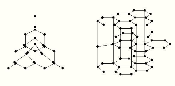 рис. 13 Шары второго слоя, для того чтобы они легли наиболее плотно, должно быть помещены в лунки первого слоя. Заполнить все лунки шарами того же самого размера нельзя, поэтому лунки заполняются через одну. Предположим, лунки отмеченные крестиком, остались пустыми, а лунки, отмеченные точками, заполнены шарами, очевидно, характер плотной упаковки не изменился бы, если бы шарами заполнили лунки, отмеченные крестиком. Плотную упаковку из трёх слоёв можно сделать двумя различными способами. Действительно, чтобы получить плотнейшую упаковку, мы должны укладывать шары третьего слоя в лунки второго слоя. Однако шары третьего слоя при этом можно расположить либо так, что центры их будут лежать над лунками первого слоя, либо так, чтобы центры их лежали над центрами шаров первого слоя. Эти две трёхслойные постройки имеют одинаковую плотность упаковки, но структурно они отличаются друг от друга. Первой из них соответствует гранецентрированная кубическая элементарная ячейка, второй - гексанальная. При этом каждый атом, находящийся внутри упаковки, имеет 12 соседей.