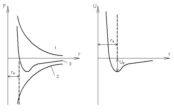 2.3. Структура атомных кристаллов Молекулярные, ионные и металлические кристаллы имеют плотноупакованные структуры вследствие того, что силы связи имеют симметричный характер. Кроме того, для этих сил не существует предельного числа атомов, на которые они могут действовать. Ковалентные связи имеют совершенно другой характер. Они определяют число возможных «соседей» атома в кристалле и носят, кроме того, направленный характер. Например, атом углерода в кристалле может иметь только четырёх соседей, ибо он может образовывать только четыре ковалентные связи с окружающими его атомами. Кроме того, электронные облака валентных электронов имеют определённое расположение в пространстве; при «обобществлении» электронов электронные облака, частично перекрываясь, выстраиваются в цепочку и вынуждают атомы занять вполне определённое положение в пространстве. В результате каждый атом углерода оказывается в вершине правильного тетраэдра. Таким образом, структура атомных кристаллов не является плотноупакованной. Она определяется числом и видом ненасыщенных связей атомов. 2.4. Полиморфизм Ни у кого не вызывает удивления тот факт, что разные вещества, имея различный химический состав, обладают весьма отличными друг от друга свойствами. Гораздо удивительнее то, что некоторые вещества, обладая, весьма различными свойствами, имеют одинаковый химический состав. Возьмём, например, олово. Это металл с характерным блеском, белого цвета, ковкий, обладающий, как и все металлы, хорошей электропроводностью и теплопроводностью. И рядом какое-то порошкообразное вещество серого цвета. Кажется, что между ними общего? А между тем химический анализ показывает, что этот порошок тоже олово. Или алмаз - одно из самых твёрдых веществ, диэлектрик. Искусные руки ювелира превращают его в бриллиант, сверкающий драгоценный камень, играющий всеми своими гранями. Что общего у него с графитом - черным, легко расслаивающимся, электропроводным? А между тем химический анализ показывает, что графит, как и алмаз, представляет собой углерод в чистом виде. Отличие алмаза от графита, серого олова от белого объясняется различием их кристаллических структур. У алмаза пространственная решётка объёмная, у графита - плоская, слоистая. алмаз графит Свойства веществ иметь две различных кристаллические структуры называются полиморфизмом. Полиморфизм присущ практически все веществам. При одних условиях (температура и давления) энергетически выгодны одни структуры, при других - другие. Так, например, белое олово при низких температурах превращается в серое. Полиморфные превращения некоторых веществ возможны лишь при очень высоких давлениях. 2.5. Энергия связи молекул в кристалле Рассмотрим взаимодействие двух частиц. На большом расстоянии частицы практически не взаимодействуют между собой. При сближении атомов появляются как силы притяжения между ними, так и силы отталкивания. Силы притяжения и силы отталкивания по-разному зависят от расстояния r между частицами. При уменьшении расстояния между частицами силы отталкивания возрастают быстрее, чем силы притяжения. На рисунке 16 линиями 1 и 2 изображена зависимость этих сил от расстояния между этими частицами. Силы притяжения действуют между разноимёнными зарядами и потому являются отрицательными, силы отталкивания действ