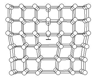 Точечные дефекты - это нарушение кристаллической решётки в изолированных друг от друга точках. К точечным дефектам относятся вакансии, т.е. такие узлы решётки, в которых нет атомов (дырки) (рис48а). Точечными дефектами могут быть атомы внедрения, т.е. лишние атомы, поместившиеся в промежутках между атомами, расположенными в узлах кристаллической решётки (рис 48б). Это могут быть и примеси (инородные атомы), занимающие места в решётке (рис48в). Размеры точечных дефектов примерно равны диаметру атома. Образования дефектов: в результат теплового движения атомов и их взаимодействия возможны отклонения энергии отдельных атомов от среднего значения, при котором атом удерживается в узле кристаллической решётки. При этом большие отклонения от средней величины менее вероятны, чем малые отклонения. Однако большие отклонения, превышающие среднее значение энергии на несколько порядков всё-таки возможны. Дефекты могут появиться также в процессе роста кристалла. Образование точечных дефектов возможно в процессе роста кристалла и из-за флуктуации энергии. Экспериментально подтверждает наличие точечных дефектов в кристаллах явление диффузии в твёрдых телах. На самом деле, в кристалле без дефектов никакой диффузии не должно было бы быть. Если атомы колеблются около узлов кристаллической решётки и не «покидают» эти положения, то не может быть проникновения атомов одного кристалла в другой. Между тем установлено, что диффузия в твёрдых телах происходит, хотя и в меньших масштабах, чем в газах и жидкостях. Особенно интересно, что интенсивность этого процесса растёт с увеличением температуры. Согласно этой теории диффузия в кристаллах происходит за счёт движения атомов внедрения, движения вакансии или какого-либо обмена местами между атомами. Для того чтобы атомы внедрения «перебрались» в другие промежутки между узлами, а вакансии - в другие узлы, необходимо, чтобы атомы, составляющие непосредственное окружение точечного дефекта, «расступились». При повышении температуры атомы «расступаются» чаще и дефекты перемещаются по кристаллу быстрее, а следовательно, и процесс диффузии происходит быстрее. Кроме того, с ростом температуры увеличивается и число точечных дефектов. Однако определяющим фактором в увеличении интенсивности диффузии при увеличении температуры является не рост числа дефекта, а их продвижение. 4.4 Дислокации Дислокации - это перемещения. Различают два вида дислокаций: краевую и винтовую. Краевая дислокация (рис24).