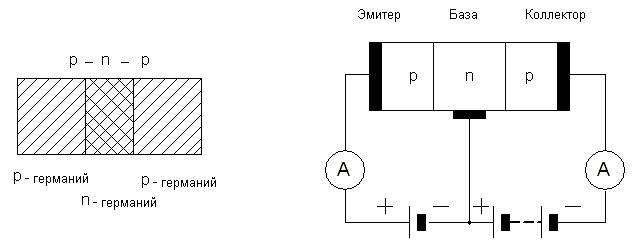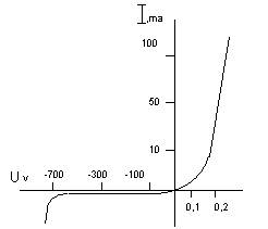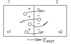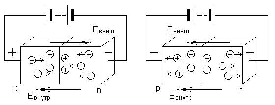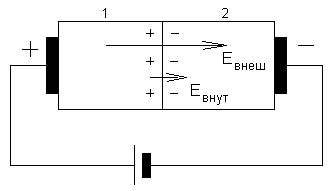 5.10. Зависимость сопротивления контакта от внешнего напряжения Двойной электрический слой, возникающий вдоль поверхности соприкосновения двух металлов, двух полупроводников или металла и полупроводника, обладает ещё способностью изменять электрическое сопротивление в зависимости от направления внешнего электрического поля источника тока. Подсоединим контакт двух металлов 1 и 2(рис 39) к источнику постоянного тока. Если к металлу 1 подсоединить плюс, а к металлу 2 – «-» источника, то тогда направление электрического поля источника и направление внутреннего электрического поля в двойном электрическом слое будут одинаковыми. Суммарное электрическое поле ещё больше затруднит движение электронов в контактном слое. рис. 39 Толщина двойного слоя и контактная разность потенциалов возрастут. Можно сказать, что увеличилось сопротивления контактного слоя, так как ток в цепи уменьшится. Если к металлу 2 присоединить положительный, а к металлу 1-отрицательный полюс источника, то направление внешнего электрического поля и электрического поля контактного слоя будут противоположны. Суммарное электрическое поле напряжённостью Е=Евнеш-Евнут оказывает меньшее тормозное воздействие на движущиеся электроны, и преимущественное движение электронов из металла 1 в металл 2 станет более активным. Толщина двойного электрического слоя и контактная разность потенциалов уменьшатся, что равносильно уменьшению электрического сопротивления контакта. Приложенное внешнее напряжение источника тока называют прямым, если оно уменьшает сопротивление контакта, и обратным, если оно увеличивает его сопротивление. Однако при контакте двух металлов изменение концентрации электронов при прямом и обратном напряжении не очень заметно. Ведь концентрация электронов в металлах огромна – порядка 1028м-3. Поэтому явление зависимости сопротивления двойного электрического слоя от приложенного напряжения особенно ярко проявляется при контакте двух полупроводников с различным типом проводимости. Если внешнее электрическое поле направить навстречу внутреннему, то под действием сил этого поля основные носители зарядов устремляются к р-n-переходу, внедряются в него, насыщают его(рис40). В результате этого сопротивления р-n-перехода уменьшается. В цепи установится значительный ток, созданный основными носителями тока. Если к р-n-переходу приложить внешнее напряжение так, чтобы напряжённость тока, была направлена в ту же сторону, что и напряжённость двойного слоя, то часть основных носителей тока под действием сил этого поля уйдёт из приконтактной области к соответствующим полюсам и нейтрализует там (рис41) рис. 40 рис. 41 Следовательно, приконтактная область ещё больше обеднится основными носителями тока, а это означает сопротивления р-n-перехода значительно возрастёт. Ток во всей цепи будет очень малым, так как он определяется лишь движением не основных носителей тока, которых немного по сравнению с основным. Зависимость тока в цепи, содержащей р-n-переход, от напряжения источника тока изображена на рисунке 42. При прямом напряжении сила, начиная с некоторого значения, почти линейно зависит от напряжения. Следовательно сопротивления р-n-перехода сначала постепенно уменьшается, а затем остаётся почти постоянным. При обратном напряжении на некотором участке ток 