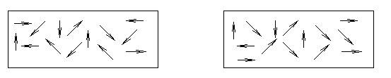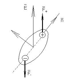 7.1.Нематическая жидкость. Жидкости сильно отличаются от газов и твёрдых кристаллов. Атомы или молекулы, из которых состоит жидкость, не могут разойтись на сколь угодно большое расстояние друг от друга. Это означает, что в жидкости очень важны силы притяжения между атомами или молекулами. То же самое можно сказать и о твёрдом кристалле, но в кристалле эти силы настолько велики, что атомы вынуждены занимать в нём определённые места, образуя трёхмерную кристаллическую решётку. В такой решётке всегда имеются выделенные направления, называемые осями кристалла. Вдоль этих направлений атомы располагаются в строго периодическом порядке. В обычной жидкости нет никаких выделенных направлений, она не обладает собственной формой, потому что молекулы жидкости не столь прочно связаны друг с другом и могут перемещаться в пространстве – перескакивать с места на место. Таким образом, в текучей жидкости молекулы только в среднем находятся на некотором характерном расстоянии друг от друга. Ответ на вопрос, как взаимодействуют между собой молекулы и чему равно среднее расстояние а между ними, дает квантовая механика. Оказывается, что на больших расстояниях между молекулами их взаимодействие определяется силами притяжения, а на очень малых расстояниях – силами отталкивания Следовательно, молекулы не могут сблизиться на сколь угодно малое расстояние из-за очень больших сил отталкивания - в этом случае говорят, что молекулы не могут проникать друг в друга. На расстоянии а, примерно равном размеру молекул, сила, взаимодействующая между молекулами, становится равной нулю. Так устроена обычная жидкость, состоящая из относительно простых молекул или атомов. Однако нас поджидает замечательное открытие, если молекулы имеют ярко выраженную анизотропную форму, то есть если у молекул можно четко выделить какие-нибудь характерные оси. рис.53 Такие молекулы схематически изображены на рис53. В них атомы располагаются не, как попало, а выстроены вдоль определённой линии (рис53а) или лежат в выделенной плоскости (рис53,б). Взаимодействие молекул такой формы приводит к тому, что в жидком состоянии они не только удерживаются на некотором среднем расстоянии друг от друга, но могут сохранять определённый порядок в своём относительном расположении – длинные оси молекул (рис54а) или плоскости молекул (рис54б) рис. 54 оказываются параллельными друг другу. В такой необычной жидкости появляется особое направление, как в твёрдом кристалле, вдоль которого ориентируются выделенные оси молекул. Это сходство между кристаллом и описанной удивительной жидкостью и провело к соединению двух понятий в одно новое – «жидкий кристалл». А жидкое состояние (рис54) называют нематическим жидким кристаллом. Название «нематичекий» образовано от греческого слова νήμά - нить. В жидких кристаллах под микроскопом видны тонкие подвижные нити, которые представляют собой дефекты структуры. В идеальном жидком кристалле таких нитей нет. Рассмотрим теперь силы, действующие в нематической жидкости. Эти силы - электрического происхождения. Интересно, что сила притяжения возникает между двумя атомами или молекулами, которые сами по себе являются электрически нейтральными. Посмотрим, как это получается. Представим себе, что по какой-то причине в атоме произошло смещение отрицательно заряж