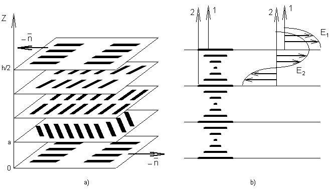 рис 55 Действительно, молекулы должны притягиваться. Но как? Ясно, что по описанным выше причинам большая часть атомов молекулы стремится оказаться вблизи атомов другой молекулы, так как только в этом случае силы взаимодействия между молекулами обращаются в нуль. Но такая ситуация возможна только тогда, когда длинные оси молекул параллельны друг другу. Таким образом, возникает определённый порядок в ориентации молекул и появляется выделенное направление. Это направление можно характеризовать единичным вектором (рис53,54). Разумеется, такое параллельное расположение выделенных осей молекул возможно только при достаточно низкой температуре, когда тепловые толчки не настолько сильны, чтобы разрушить ориентационный порядок в системе молекул. При повышении температуры обязательно наступает момент, когда хаотическое тепловое движение молекул становится преобладающим и нематический порядок разрушается. Таким образом, система таких особых молекул может иметь два состояния: обычное (изотропное) жидкое - при высоких температурах и анизотропное жидкое – при низких температурах. Подчеркнём, что нематический жидкий кристалл может быть действительно жидким, как вода, то есть центры масс молекул не образует в данном случае какую-то правильную решётку, как в кристалле, а располагаются хаотично в пространстве и могут в нём свободно перемещаться. В то же время ориентация молекул в этой жидкости подчиняется строгому порядку. Интересно, что нематическая жидкость, образуемая молекулами вытянутой формы известна уже много десятков лет, в то время как нематическая жидкость из дискообразных молекул открыта только в 1979-1980 года. 7.2.Холестерическая жидкость. Структура холестерической жидкости во многом сходна с нематической, но имеет одно существенное отличие. Можно сказать, что холестерик обладает нематическим состоянием послойно, то есть состоит из стопки нематических слоёв(рис56а). но оси этих параллельных друг другу слоёв развёрнуты на некоторый угол, причём для двух соседних слоёв этот угол составляет малую величину α=0,5°. Расстояние между соседними слоями примерно равно поперечному размеру молекулы а. если двигаться вдоль оси Z, перпендикулярной плоскости слоёв, то через число слоёв N=π/а ориентация молекул станет такой же, как и в самом первом слое. Расстояние h=а*2π/а, через которое повторяется ориентация молекул в пространстве, представляет собой удвоенный период своеобразной решётки (рис56б). Величину h принято называть шагом спирали, которую образуют в пространстве концы молекул, лежащих в последовательных слоях. Описанная периодическая решётка – её называют холестерической спиралью - удивительна тем, что чёткая периодичность в ней касается только ориентации молекул. В то же время в каждом нематическом слое молекулы могут свободно перемещаться, меняться местами; словом, холестерическая жидкость свободно течёт вдоль таких плоскостей, но спираль при этом почти не нарушается.