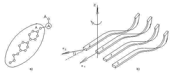 рис. 56 Молекулы могут перемещаться и из слоя в слой, поворачиваясь при этом на угол α, но это даётся им не так легко. Всё это и определяет особые свойства холестерической жидкости, схожие за свойствами твёрдого кристалла. Особенности структуры холестерической жидкости наиболее сильно проявляются при изменении температуры вещества, и при различных внешних воздействиях. Холестерическая спираль обладает яркими оптическими свойствами, чувствительна к малейшим повреждениям столь своеобразной решётки. Всё это вызвало громадный интерес к изучению и применению холестерических жидких кристаллов. Чем вызвана такая структура холестерика? Объяснения заключается в особенности строения молекул, из которых состоят эти вещества. Молекулы холестерика - почти такие же, как в нематической жидкости, но имеют на своём конце небольшой отросток (рис57а). Этот отросток образуется обычно одним или несколькими атомами, которые выступают из основной плоскости, содержащей подавляющее большинство атомов молекулы. Симметрия молекулы нарушается из-за отростка и напоминает симметрию руки, которая бывает только правой и только левой. Как сказывается такая форма молекул на ориентационном порядке жидкости? Подобные молекулы можно расположить параллельно друг другу в определённой плоскости, например в плоскости, в которойлежат сами молекулы. Именно эти плоскости и образуют отдельные слои холестерика (рис57б). А как могут быть «пристроены» друг к другу эти слои? Очевидно, что молекулы слоя 2 могут быть параллельны молекулам слоя 1, если слои расположены друг от друга на расстоянии, примерно равном высоте отростков. В этом случае отростки не мешают молекулам оставаться параллельными. рис. 57 Если расстояние между слоями меньше высоты отростков, то векторы n1 и n2 не могут быть строго параллельны – мешают отростки. Поэтому между векторами n1 и n2 имеется малый угол α. Таким образом, мы приходим к выводу, что несимметричные молекулы должны образовывать стопку нематических слоёв, причём от слоя к слою молекулы должны поворачиваться на определённый угол α. В зависимости от того, как изогнуты отростки отдельных молекул, холестерические спирали могут быть либо правыми, либо левыми.