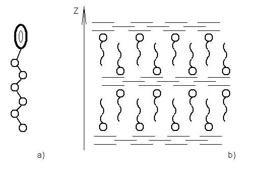 7.3.Жидкие кристаллы-растворы. Жидкокристаллическое состояние можно получить и при растворении подходящих веществ в растворителе, например в воде, который сам по себе не образует жидкий кристалл. При этом получается самые разные жидкие кристаллы. Если молекулы растворяемого вещества имеют форму стержня – получается нематическая жидкость; если у стержнеобразных молекул имеются отростки - холестерическая жидкость. Можно получить и более сложные состояния. В таких жидких кристаллах важную роль играют не только силы притяжения между молекулами, но и силы отталкивания молекул на близких расстояниях. Роль сил отталкивания можно наглядно представить себе следующим образом. В большом объёме при высокой температуре молекулы, например стержнеобразные, не подчиняются никакому ориентационному порядку, то есть поворачиваются в пространстве как угодно. Но чтобы при всевозможных поворотах молекулы не мешали друг другу, надо каждой молекуле отвести в жидкости определённый объём. Этот объём представляет собой кубик с размером ребра, примерно равным длине молекулы l; в пределах такого кубика с объёмом l3 молекула действительно может быть ориентирована как угодно. Поместим теперь тоже число молекул при той же температуре в меньший объём, то есть повысим плотность системы. В результате на каждую молекулу станет приходиться объём, меньший, чем l3. Как будут размещаться молекулы в этом случае? Естественно, они смогут разместиться в меньшем объёме, если не будут поворачиваться как угодно, задевая друг друга, а займут более или менее параллельные положения. Если размер поперечного сечения молекул а заметно меньше l и на каждую молекулу приходится объём ~а2l, то все молекулы должны быть ориентированы одинаково, так как только в этом случае они не задевают друг друга. Но это может лишь произойти в случае очень высокой плотности. При средней плотности, когда на каждую молекулу приходится объём, меньший, чем l3, но больший чем а2l, ориентационный порядок будет неполным, но заметным. И связан этот порядок с тем, что молекулы не могут из-за сильного отталкивания проникать друг в друга. Плотность стержнеобразных молекул можно изменять без заметного изменения общего объёма жидкости, когда такие молекулы растворяются в каком-нибудь обычном растворителе, например в воде. Повышая содержание воды в соответствующем растворе, мы получаем обычную неориентированную жидкость. При очень малом же содержании растворителя образуется нематическая или холестерическая жидкость, в зависимости от деталей структуры молекул. Растворы полимерных молекул являются как раз нематическими жидкими кристаллами. Работу клеток живого организма во многом определяют жидкие кристаллы-растворы, которые образуются из специальных молекул. Эти молекулы устроены более сложно. Их взаимодействие друг с другом и с молекулами растворителя характеризуются силами отталкивания и силами электростатического притяжения. Она состоит из небольшой головки (рис58а), представляющей собой электрический диполь, и длинного незаряжённого хвоста. рис.58 Напомним, что молекулы воды - тоже электрические диполи. Противоположно заряжённые концы диполей притягиваются друг к другу, и поэтому молекулярные головки притягивают воду. В тоже время хвосты молекул химически устроены так, что они отталкиваю