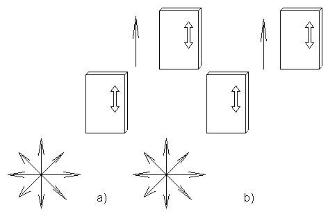 Определённым образом должны сориентироваться и механические моменты атомов. Если же теперь сердечник перемагнитить, изменив направление тока в соленоиде, то должна произойти переориентация, как магнитных моментов, так и их механических моментов. А стержень в результате этого должен вращаться. Однако возникшие в опыте Эйнштейна и де Газа при такой его постановке эффект весьма незначителен и учёные усилили его, воспользовавшись явлением механического резонанса. На соленоид подавалось переменное напряжение, частота которого совпадала с частотой собственных крутильных колебаний системы. Световой зайчик в этом случае смещался вполне заметно. В опыте Эйнштейна и Де Газа было определенно гиромагнитное отношение Г. Оно оказалось равным е/m, т.е. ферромагнетизм обусловлен не орбитальными, а спиновыми магнитными моментами. 6.7. Ферромагнетизм и кристаллическая решётка. Доменная структура ферромагнетиков. Возникает вопрос: почему у парамагнетиков не появляются свойства, присущие ферромагнетикам, ведь спиновые магнитные моменты есть и у электронов атомов парамагнетиков. Оказывается, дело не только в наличии нескомпенсированных спиновых магнитных моментов электронов, но и в существовании особого взаимодействия между этими электронами в теле. Ферромагнетизм присущ не любым веществам и веществам не в любом состоянии, а возможен лишь в кристаллическом состоянии некоторых веществ и при температурах ниже некоторой температуры, определённой для данного вещества. Это - вещества, у которых в электронной оболочке есть незаполненные внутренние слои, в них и получаются нескомпенсированные спиновые моменты. Объяснения сильной намагниченности ферромагнетиков впервые пытался дать русский физик Б.Л.Розинг, который в 1892 г. высказал предположение о том, что в ферромагнетиках под действием особых сил возникают определённые намагниченные участки. В 1902г. французский физик П.Вейс высказал гипотезу о наличии в ферромагнитном кристалле областей - доменов, которые намагничены до насыщения. При отсутствии внешнего магнитного поля магнитные моменты отдельных доменов направлены различно и общий магнитный момент тела равен нулю. В магнитном поле эти намагниченные участки ориентируются по полю. Гипотеза Вейса о доменной структуре ферромагнетиков получила теоретическое обоснование лишь в 1935г. в работах советских физиков Л.Ландау и Е.Лившица. Было установлено, что существуют особые силы, описываемые квантовой механикой, которые заставляют все спины внутри домена выстраиваться параллельно. Хотя линейные размеры доменов невелики (от 10-2 до 10-5см), их удаётся наблюдать в микроскопе. Ещё в 1931 г. советские физики Н.Акулов и М.Дехтяр, а также независимо от них американский физик С.Биттер предложил метод наблюдения доменной структуры ферромагнетиков, получивший название метода порошковых фигур. Поверхность кристалла ферромагнетика полируют и наносят на неё каплю водной суспензии тонко измельчённого ферромагнитного порошка, частицы которого оседают на границах доменов. Благодаря этому они становятся видимыми в микроскоп. 6.8. Антиферромагнетизм и ферримагнетизм (ферриты). У ферромагнетиков есть домены, в которых все спины ориентированы параллельно (рис52,а). В 1933г. Л.Ландау предсказал, что должны существовать вещества, у которых спины в доменах ор