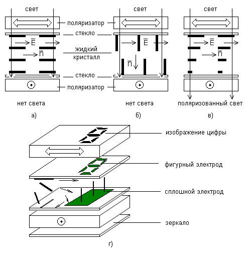 7.6.Избирательное отражение света холестериками Важнейший оптический эффект, наблюдаемый в холестерической жидкости, заключается в избирательном отражении света слоем холестерика. Холестерические плоскости, как и обычные кристаллические плоскости, могут отражать падающие на них волны. Волны, отражённые разными плоскостями, могут при интерференции, и ослаблять, и усиливать друг друга. Если свет падает перпендикулярно плоскостям, то условие усиления таково: между соседними эквивалентными плоскостями должно укладываться строго пол волны падающего света. Мы хотим, чтобы колебания, отражённых от первой и второй плоскостей, проходили в одинаковых фазах, то есть значение электрического поля Е в каждой точке и в любое время были одинаковы. При этом амплитуда Ео обеих волн складываются - происходит усиления света. Так будет если волна 2 (рис64,б), вошедшая в кристалл, на пути от первой ко второй плоскости и обратно отстанет от волны 1 ровно на длину волны λ. Но в холестерике такие плоскости находятся на расстоянии h/2 друг от друга. Поэтому условие усиления в данном случае есть h/2=λ/2, или h=λ. Свойство холестерика отражать свет с избранной длинной волны (h=λ) обуславливает соответствующую окраску вещества, которая зависит от шага холестерической спирали. А шаг спирали очень сильно зависит от температуры. Обычно вещество при высокой температуре (в изотропном состоянии) бесцветно, затем, в момент перехода в холестерик (при меньшей температуре), синеет и при дальнейшем понижении температуры последовательно приобретает все цвета спектра, от синего до красного. Это означает, что по мере охлаждения холестерической жидкости шаг спирали увеличивается, а при нагревании - уменьшается. Такое поведение холестерической спирали нетрудно объяснить. В силу особенностей взаимодействия молекул с отростками оси n1 и n2 не могут образовать между собой слишком малый угол. Но с повышением температуры в результате тепловых колебаний молекул в каждом нематическом слое увеличивается разброс молекулярных ориентаций относительно выделенного направления n. Оси отдельных молекул в нематическом слое оказываются не параллельными выделенному направлению n. Поэтому при нагревании угол между осями n1 и n2 соседних слоёв должен увеличиваться, чтобы тепловые колебания не приводили к критическому угловому сближению молекул. Увеличение угла α, характеризующего закручивание осей n в пространстве, и вызывает уменьшение шага холестерической спирали по мере увеличения температуры. Выше описанное явление лежит в основе широкого применения холестериков в качестве простых и эффективных термоиндикаторов для медицинской диагностики, отыскания повреждений в сложных электронных схемах, контроля температурного поля в лопатках турбин и т. п. Сейчас синтезированы холестерические вещества, в которых весь спектр цветов, от красного до синего, наблюдается при изменении температуры всего на 0,01 градуса, что говорит о большой чувствительности устройств на их основе. Шаг холестерической спирали также очень чувствителен к содержанию примесей в холестерике, и поэтому эти вещества могут служить надёжными индикаторами загрязнений в атмосфере. Нематические жидкости нашли широкое применение и в совсем другом плане. Оказывается, полимерные нити, получаемые из хорошо ориентирован