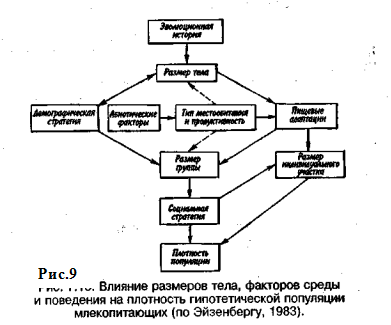 Если воздействия модифицирующих факторов приводят лишь к преобразованиям (модификациям) колебаний численности, не устраняя их, то регулирующие факторы, выравнивая случайные отклонения, стабилизируют (регулируют) численность на определенном уровне. Однако на разных уровнях численности популяции регулирующие факторы принципиально различны (рис. 8). Например, хищники-полифаги, способные при изменении численности жертв ослабить или усилить свою активность—функциональная реакция,— оказывают действие при сравнительно низких значениях численности популяции жертвы. Хищники - олигофаги, характеризующиеся в отличие от полифагов численной реакцией на состояние популяции жертвы, оказывают на нее регулирующее действие в более широком диапазоне, чем полифаги. При достижении популяцией жертвы еще более высокой численности создаются условия для распространения болезней и, наконец, предельный фактор регуляции — внутривидовая конкуренция, ведущая к исчерпыванию доступных ресурсов и развитию стрессовых реакций в популяции жертвы. На рис. 8 представлена многозвенная буферная система регулирования численности популяции под воздействием биотических факторов, степень влияния которых зависит от плотности популяции. В реальной ситуации данный параметр зависит от большого числа факторов, в частности и тех, которые не оказывают регулирующего воздействия на плотность популяции по принципу обратной связи. Взаимодействие между модифицирующими, регулирующими, а также такими специфическими факторами, как размеры тела, группы и индивидуального участка, при их влиянии на плотность популяции млекопитающих показано на рис. 9. Таким образом, чтобы получить исчерпывающую информацию о том, какие факторы вызывают колебания численности, теоретически требуются данные о физико-химических условиях, обеспеченности ресурсами, жизненном цикле этих организмов и влиянии конкурентов, хищников, паразитов и т. д., причем нужно знать, как все эти факторы влияют на рождаемость, смертность и миграцию. Все популяции непрерывно изменяются: новые организмы рождаются или прибывают как иммигранты, а прежние гибнут или эмигрируют. Несмотря на это, флуктуации размера популяции не безграничны. С одной стороны, она не может расти беспредельно, а с другой — вымирают виды достаточно редко. Следовательно, один из основных признаков популяционной динамики —сочетание изменений с относительной стабильностью. При этом колебания размеров популяций сильно различаются у разных видов.