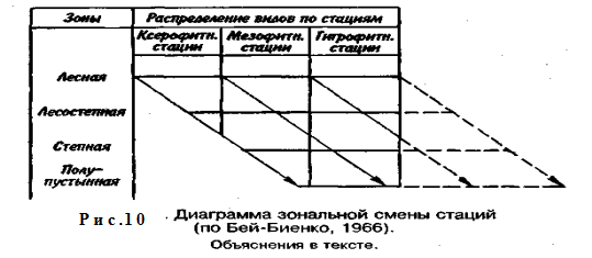 На уровне популяции абиотические факторы воздействуют на такие параметры, как рождаемость, смертность, средняя продолжительность жизни особи, скорость роста популяции и ее размеры, нередко являясь важнейшими причинами, определяющими характер динамики численности популяции и пространственное распределение особей в ней. Популяция может приспосабливаться к изменениям абиотических факторов, во-первых, меняя характер своего пространственного распределения и, во-вторых, путем адаптивной эволюции. Избирательное отношение животных и растений к факторам среды порождает избирательность и к местообитаниям, т. е. экологическую специализацию по отношению к участкам ареала вида, которые он пытается занять и заселить. Участок ареала, занятый популяцией вида и характеризующийся определенными экологическими условиями, называется стацией. Выбор стации, как правило, определяется каким-нибудь одним фактором; это может быть кислотность, соленость, влажность и т. д. Для эвритермных видов характерна зональная смена стаций, т. е. строго направленное изменение стаций при переходе вида из одной природной зоны в другую: при передвижении к северу избираются более сухие, хорошо прогреваемые открытые стации с разреженным растительным покровом, часто располагающиеся на легких песчаных или каменистых почвах; при передвижении к югу тот же вид заселяет более увлажненные и тенистые стации с густым растительным покровом и с глинистыми почвами (рис. 10). На приведенной диаграмме по характеру растительного покрова и микроклимату все стации разбиты на три экологические группы — ксерофитные, мезофитные и гигрофитные. Смещение популяций вида в более влажные стации при продвижении к югу показано косыми стрелками. При этом влаголюбивые популяции лесной и отчасти лесостепной зон лишаются возможности проникнуть в южные районы, так как более влажные, чем гигрофитные, стации физически и экологически немыслимы.