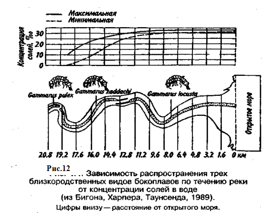 Мокрица Lygia oceanica обитает по берегам морей. Дневное время мокрицы проводят в укрытии. Но когда температура воздуха повышается до 20 °С снаружи и до 30 °С под галькой, они покидают свои укрытия и выползают на скалы, обращенные к солнцу. Причина такого перемещения состоит в том, что данный вид, очень плохо приспособленный к наземному местообитанию, имеет легкопроницаемую кутикулу. Когда влажность воздуха низкая, мокрица теряет много воды путем испарения, что и происходит на скалах, находящихся под солнцем. Интенсивное испарение снижает температуру тела животного, которая при нахождении его на скале равна 26 °С (рис. 11). Если же, мокрица продолжает прятаться под галькой, где относительная влажность близка к 100%, а испарение равно нулю, температура тела достигает 30 °С. Распределение стаций в водной среде обусловлено другими факторами, в частности кислотностью. Кислые воды торфяников способствуют развитию сфагновых мхов, но в них совершенно нет двустворчатых моллюсков-перловиц. Чрезвычайно редки в них и другие виды двустворчатых моллюсков, что связано с отсутствием в воде извести. Рыбы выносят кислотность воды в пределах рН от 5 до 9. При рН ниже 5 можно наблюдать их массовую гибель, хотя отдельные виды приспосабливаются и к среде, значение рН которой доходит до 3,7. Продуктивность пресных вод, имеющих кислотность менее 5, резко понижена, что влечет за собой значительное сокращение уловов рыбы. Другой важный фактор, лимитирующий распределение водных животных и растений,—это соленость воды. Многие крупные таксономические группы в ранге типа иглокожие, кишечно-полостные, мшанки, губки, кольчатые черви и др.) все или почти все являются морскими.