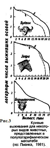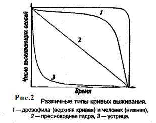 Репродукционные возможности популяции зависят от ее возрастного состава. Продолжительность жизни особей популяции можно оценить, используя кривые выживания. Существует три типа кривых выживания (рис. 2).