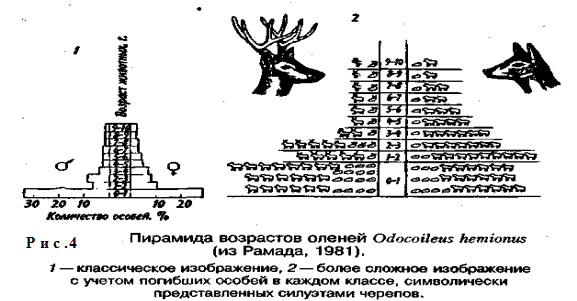 Первый тип (кривые 1) соответствует ситуации, когда большее число особей имеет одинаковую продолжительность жизни и умирает в течение очень короткого отрезка времени. Кривые характеризуются сильно выпуклой формой. Такие кривые выживания свойственны человеку (рис. 2, 1), причем кривая выживания для мужчин по сравнению с аналогичной кривой для женщин менее выпуклая, поэтому страховой полис для мужчин в большинстве стран Запада в 1,5 раза дороже, чем для женщин. Для большинства копытных кривые выживания также выпуклые (рис. 3), хотя и в различной степени для разных видов, а также в зависимости от пола. Второй тип (рис. 2, 2) свойствен видам, коэффициент смертности которых остается постоянным на протяжении всей их жизни. Поэтому кривая выживания трансформируется в прямую линию. Такая форма кривой выживания свойственна пресноводной гидре. Третий тип (рис. 2, 3) — сильно вогнутые кривые, отражающие высокую смертность особей в раннем возрасте. Так характеризуется продолжительность жизни некоторых птиц, рыб, а также многих беспозвоночных. Знание типа кривой выживания дает возможность построить пирамиду возрастов (рис. 4). Следует различать три типа таких пирамид. Пирамида с широким основанием, что соответствует высокому проценту молодняка, характерна для популяции с большим значением коэффициента рождаемости. Средний тип пирамиды соответствует равномерному распределению особей по возрастам в популяции со сбалансированными коэффициентами рождаемости и смертности — пирамида выровненная. Пирамида с узким основанием (обращенная), отвечающая популяции с численным преобладанием старых особей над молодняком, характерна для сокращающихся популяций. В таких популяциях коэффициент смертности превышает коэффициент рождаемости.