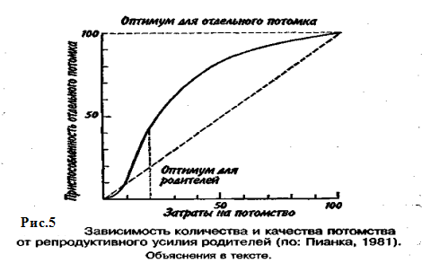 Большое значение для увеличения численности популяции имеют затраты на потомство, выражающиеся в определенной тактике размножения. Не все потомки равноценны: те из них, которые произведены на свет в конце вегетационного сезона, обычно имеют меньшую вероятность дожить до взрослого состояния по сравнению с потомками, появившимися на свет раньше. Сколько усилий должны родители затрачивать на каждого потомка? При постоянной величине репродуктивного усилия средняя приспособленность отдельного потомка связана обратным соотношением с их числом. Один крайний вариант тактики размножения — вложить все в единственного очень крупного и хорошо приспособленного потомка, другой — максимально увеличить общее число произведенных на свет потомков, вложив в каждую особь как можно меньше. Однако наилучшая тактика размножения —это компромисс между производством максимально большого числа потомков и образованием потомства максимально высокой приспособленности. Указанное соотношение количества и качества потомства иллюстрирует простая графическая модель (рис. 5).