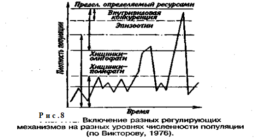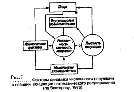 Подобная картина наблюдается, например, у леммингов. При пике численности плотность леммингов становится избыточной, и они начинают мигрировать. Элтон так описал миграции леммингов в Норвегии: животные проходили через деревни в таком количестве, что собаки и кошки, которые вначале нападали на них, просто перестали их замечать. Достигнув моря, обессиленные лемминги тонули. Регуляция численности равновесных популяций определяется преимущественно биотическими факторами. Среди них главным фактором часто оказывается внутривидовая конкуренция. Примером может служить борьба птиц за мести для гнездования. Внутривидовая конкуренция может быть причиной физиологического эффекта, известного под названием шоковой болезни. Его отмечают, в частности, у грызунов. Когда плотность популяции становится слишком большой, шоковая болезнь приводит к снижению плодовитости и увеличению смертности, что возвращает плотность популяции к нормальному уровню. У некоторых видов животных взрослые особи питаются собственным приплодом. Это явление, известное как каннибализм, снижает численность популяции. Каннибализм свойствен, например, окуням: в озерах Западной Сибири 80% пищи крупных особей составляет молодь того же вида. Молодь, в свою очередь, питается планктоном. Таким образом, когда нет других видов рыб, взрослые особи живут за счет планктона. Межвидовые взаимодействия также играют существенную роль в контроле плотности популяции. Взаимодействия паразит-хозяин и хищник-жертва часто за висят от плотности. Болезни также являются фактором, принимающим участие в регуляции плотности популяции. Когда кролики болеют миксоматозом, вызываемым вирусом, распространение инфекции идет гораздо быстрее в популяциях с повышенной плотностью. Хищничество как ограничивающий фактор само по себе имеет большое значение. Причем если влияние жертвы на численность популяции хищника не вызывает сомнений, то обратное воздействие, т. е. на популяцию жертвы, бывает не всегда. Во-первых, хищник уничтожает больных животных, тем самым он улучшает средний качественный состав популяции жертвы. Во-вторых, роль хищника ощутима только тогда, когда оба вида обладают приблизительно одинаковым биотическим потенциалом. В противном случае из-за низкого темпа размножения хищник не в состоянии ограничить численность своей жертвы. Например, только одни насекомоядные птицы не могут остановить массовое размножение насекомых. Иными словами, если биотический потенциал хищника намного ниже биотического потенциала жертвы, действие хищника приобретает постоянный характер, не зависящий от плотности его популяции. Численность насекомых-фитофагов нередко определяется комбинацией видоспецифичных реакций насекомых и растений на воздействие загрязняющих веществ. Загрязнение понижает резистентность растений, в результате чего численность насекомых возрастает. Однако при слишком большом загрязнении численность насекомых падает, несмотря на уменьшение сопротивляемости растений. Приведенная дифференциация факторов динамики численности популяций позволяет понять их реальное значение в жизни и воспроизводстве популяций. Современная концепция автоматического регулирования численности популяций базируется на сочетании двух принципиально различных явлений: модификаций
