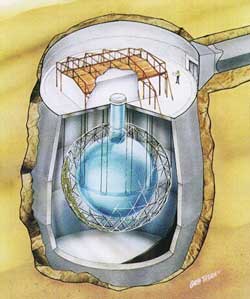 Физики из Канады, США и Великобритании заявили, что первые научные результаты, полученные в Нейтринной Обсерватории Сэдбери (Sudbury Neutrino Observatory, SNO), показывают, что Солнце генерирует столько нейтрино, сколько предсказывается современными моделями, но эти нейтрино приходят на Землю в разных формах. Результаты были представлены на ежегодной Конференции Канадской Ассоциации Физиков в г. Виктория (Британская Колумбия). Результаты раскрывают одну из беспокоящих тайн современной астрономии: почему в прошлых экспериментах обнаруживалась только третья часть нейтрино из общего количества, предсказанного моделями солнечной физики. "Мы теперь очень уверены в том, что несоответствие вызвано не проблемами с моделями Солнца, а изменениями в самих нейтрино, когда они путешествуют от сердцевины Солнца к Земле," – говорит Art McDonald, директор SNO. Чтобы исследовать это, консорциум Канадских, Американских и Британских университетов разработал Sudbury Neutrino Observatory. Обсерватория расположена под землей на глубине два километра в никелевом руднике. Для детектирования используется тяжелая вода – вода, в которой атомы водорода заменены его более тяжелым изотопом, дейтерием. При взаимодействии нейтрино с тяжелой водой испускается электрон со скоростью, большей скорости света в воде. И этот электрон генерирует световое излучение, называемое Черенковским излучением. Измеряя количество этих вспышек света, можно определить количество нейтрино. В отличие от прошлых экспериментов, детектор SNO чувствителен не только к электронным нейтрино, но и к двум другим типам нейтрино: мюонным и тау-нейтрино. Данные SNO показывают, что общее число обнаруженных нейтрино равно предсказанному числу излучаемых Солнцем электронных нейтрино. Таким образом, часть нейтрино переходит или осциллирует в два других типа нейтрино во время распространения от Солнца до Земли. Хотя результаты являются подтверждением исследований солнечных физиков, но поднимают новые проблемы для физиков, занимающихся исследованиями элементарных частиц, которые пока не могут объяснить, почему происходят осцилляции нейтрино. Полученные результаты дают также некоторый вклад в космологию. Подтверждение осцилляций нейтрино, вместе с прошлыми исследованиями, позволяет физикам установить верхний предел на предполагаемую массу нейтрино. Объединяя это с ожидаемым числом нейтрино во Вселенной, физики оценили, что общая масса нейтрино приблизительно равняется общей массе всех видимых звезд во Вселенной. СУЩЕСТВУЕТ ЛИ ПРОБЛЕМА СОЛНЕЧНЫХ НЕЙТРИНО Для решения проблемы дефицита солнечных нейтрино было предложено множество гипотез. Часть из них затрагивает астрофизику процессов в недрах Солнца, часть вводит понятие осцилляций нейтрино, часть затрагивает наши представления о пространстве-времени и его материальности. Астрофизические гипотезы базируются на более интенсивном перемешивании вещества недр Солнца и, соответственно, на уменьшении количества реакций, сопровождающихся рождением высокоэнергичных нейтрино. При этом, для обеспечения наблюдаемой светимости Солнца, в его недрах должно происходить больше низкоэнергичных реакций. (Данное объяснение конфликтует с гелиосейсмологией.) Физические гипотезы базируются на разных типах осцилляций нейтрино. То есть нейтрино, испущенное в реакция