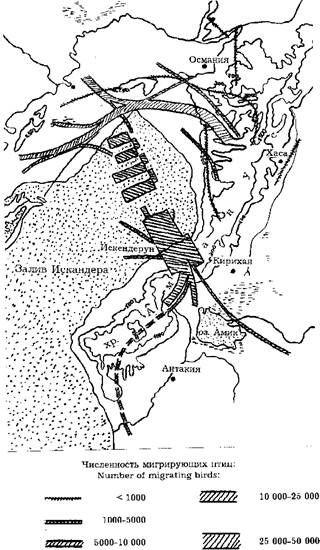 Рис. 2. Осенняя миграция белого аиста в районе залива Искендерун (по: Heckenroth, 1968). Известно, что вдоль восточного побережья Черного моря идет очень интенсивный пролет хищных птиц. Почему они концентрируются именно здесь, а не в другом месте? Многие хищники также вынуждены огибать морские пространства. Один взгляд на карту показывает, что это кратчайший путь для них из Европейской части России к пролетным путям на Ближнем Востоке. Там же птицы скапливаются в свою очередь потому, что это прямой путь к африканским зимовкам. По восточному побережью Черного моря идет и пролетный путь белого аиста, хотя и слабо выраженный (Лебедева, 1979). Он ведет из территорий с низкой его численностью. Аисты же из Закавказья и Средней Азии мигрируют уже в другом направлении. Поэтому с севера на Ближний Восток летят из парителей главным образом хищники. Дальше на юг аисты летят узким потоком по долине р. Иордан, через Мертвое море и выходят в верховья залива Акаба. Здесь птицы сворачивают на юго-запад. Большинство их пересекает Суэцкий залив в районе Эль-Тор, часть отклоняется дальше к югу. Достигнув африканского побережья, аисты выходят в долину Нила возле Кены (Koch et al., 1966; Safriel, 1968; Schüz, 1971). На Ближнем Востоке они придерживаются осенью древнего разлома, который проходит под Иорданом и Акабой. Здесь в долине наиболее благоприятные кормовые условия (Koch et al., 1966). Дальше на восток в Сирийской пустыне аисты встречаются на пролете крайне редко (Cameron, Cornwallis, 1966; Safriel, 1968). Лишь в саваннах Судана миграционный поток их начинает расширяться, в Восточной Африке образуются многочисленные ответвления, которые ведут к различным местам зимовки. Часть аистов из Средней Азии мигрирует напрямую через Аравийский п-в. Путь через пустыню не легкий, но все же он энергетически выгоднее, чем облет через Синай. Таким образом, мигрирующие белые аисты собираются по "тропинкам" и коридорам в общий магистральный пролетный путь, который идет от Балкан до долины Нила и затем снова распадается на коридоры и "тропинки". На приведенном примере хорошо видно действие 4 вышеназванных факторов, способствующих образованию пролетных путей. Аисты не могут парить над морем, поэтому образуется мощные обходные потоки вокруг Черного и Средиземного морей. Они могут парить над пустыней на Ближнем Востоке, но кормовые ресурсы там сконцентрированы в очень узкой полосе древнего разлома, и миграция идет снова плотным потоком именно там. Горы Аманус большинство птиц пересекает в энергетически оптимальном месте, за которым к тому же расположены богатые кормом биотопы. Дальнейшее направление миграции определяется расположением горного хребта и зоной устойчивых северных ветров, а затем цепью кормовых биотопов. Наибольшая концентрация миграции аистов и хищников происходит на восточном побережье Средиземного моря. Это вызывается экстремальным окружением - море с одной стороны и пустыня с другой. Т. е., как видим, упорядочивание структуры миграционного ареала есть реакция птиц на неблагоприятные условия окружающей среды. И это упорядочивание будет тем четче выражено, чем сильнее такое воздействие. Другой вариант - преодоление подобной местности одним броском. Но, подчеркнем еще раз, поскольку не все мигранты могут использовать эту стратегию, для популяции в целом образование таких пролетных путей выгодн