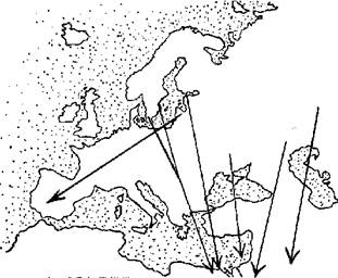 Рис. 3. Пролетные пути европейской популяции серого журавля (по: Norrevang, 1959). Искушенный читатель скажет, что вышеприведенные примеры описывают лишь переходы широкого фронта миграции в узкий, но не пролетные пути внутри широкого фронта. Да это так. Здесь мы имеем дело с крайней формой образования пролетных путей. У белого аиста узкий фронт пролета образуется в силу невозможности миграции широким фронтом, если можно так выразиться - "запрета среды" на миграцию за пределами пролетных путей. Конечно, бывают исключения: иногда наблюдаются мигрирующие стаи над Кипром (Schüz, 1980) или в пустынях Сирии (Cameron, Cornwallis, 1966), но это именно исключения, связанные к тому же часто с нарушениями ориентации, заносом ветром и т. п. Миграция белого аиста была использована нами как очень удобный пример для иллюстрации закономерностей образования пролетных путей. Что же будет в том случае, если давление среды на ход миграции оказывается менее жестким? Действие факторов, способствующих возникновению пролетных путей, будет в той или иной степени все равно проявляться. Давление факторов среды приводит к образованию вероятностного распределения признака с более или менее выраженным оптимумом. В нашем случае таким результативным признаком является плотность потока мигрантов. Пики на кривой ее распределения и будут соответствовать пролетным путям, как участкам с повышенной концентрацией птиц. Серый журавль - хороший прример перехода от жестко обусловленного расположения пролетных путей до миграции широким фронтом. В природе существуют как крайняя форма образования пролетных путей - миграция узким фронтом, - так и многочисленные промежуточные варианты. Вполне вероятно, естественно, существование и другой крайности - перелет более или менее равномерным широким фронтом без образования выраженных пролетных путей. 4 Рассмотрим в заключение образование пролетных путей на территории одного региона на примере Украины. Схемы их размещения представлены на рис. 4 и 6. Карта для осенней миграции составлена по нашим данным (Грищенко, 1994б), для весенней - по расположению миграционных потоков на фенологических картах прилета ряда видов птиц (Грищенко, Серебряков, 1988, 1990, 1992, 1993а, 1993б; Серебряков, 1989; Serebryakov et al., 1991). Существование и размещение всех их может быть объяснено действием описанных выше факторов.