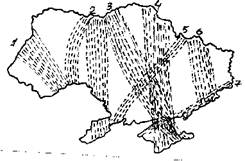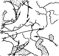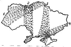 Рис. 5. Схема траекторий переноса воздушных масс в районе Украины (по: Борисов, 1975). Объяснимы также и отклонения в расположении пролетных путей у отдельных видов. Так, у черного коршуна (Milvus migrans) весной миграционный поток через центральные области Украины смещается к востоку от Крыма, дальше, чем у других птиц (Грищенко, Серебряков, 1990). Связано это с тем, что коршун, как и многие другие хищники, предпочитает мигрировать ближе к побережью Черного моря. Подобно этому, у белого аиста осенью отсутствует Крымский пролетный путь. Вместо него образуется другой, идущий на юго-запад через центральные области Украины к западному побережью Черного моря (Грищенко, Серебряков, 1992). Расположение осенних пролетных путей тоже определяется действием внешних факторов (рис. 6). Западный - это кратчайший путь из Белоруссии и Прибалтики к "воротам" между Карпатами и Черным морем. Он сливается с двумя другими пролетными путями, образуя мощный поток вдоль западного побережья Черного моря. Подобно этому существование Восточного пролетного пути связано с концентрацией птиц вдоль восточного побережья Черного моря. По нему летят мигранты из центральной части Европейской России. Вполне вероятно, что существенную роль в его расположении и направленности играет гидрология региона: миграция идет с верховий Волги и Оки вдоль долины Дона в бассейн Северского Донца и дальше на восточное побережье Азовского моря. Долины крупных рек и выступают теми экологическими руслами, которые собирают потоки мигрантов. Причем они важны не только из-за наличия благоприятных мест для отдыха и кормежки, но и являются удобными ландшафтными ориентирами, ведущими кратчайшим путем к Азовскому морю (Грищенко, 1993). Понятно, что такой ход миграции энергетически более выгоден и он будет закрепляться эволюционными механизмами.
