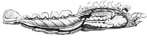 Перевернутый омар (Жоффруа Сент-Илер Э., 1822). К столь странной на первый взгляд гипотезе Жоффруа Сент-Илер пришел потому, что уже с начала научной работы был уверен в единстве строения животных. Вероятно, на его мировоззрении сказалось то, что до занятий зоологией он изучал физику - науку, уже тогда успешно объяснявшую разнообразные природные явления с помощью небольшого числа единых принципов. В 1796 г. в одной из своих первых работ Жоффруа Сент-Илер писал: “...природа замкнулась в определенных рамках и создала все живые существа по единому плану, одинаковому в принципе, но который она варьировала на тысячу ладов во всех его деталях” [2]. Любопытно, что столь общее утверждение было высказано в статье, посвященной частному вопросу систематики полуобезьян. В более поздних работах (1806 и 1807) Жоффруа Сент-Илер доказал общность строения рыб, рептилий, птиц и млекопитающих, позволившее объединить их в один тип позвоночных животных. Изучая главным образом скелет, он сумел сопоставить даже столь непохожих друг на друга животных, как рыбы и млекопитающие. Именно он обнаружил, что три слуховые косточки в черепе млекопитающих - это видоизмененные жаберные дуги рыб. Такое соответствие называется гомологией. Какие-либо структуры гомологичны, если они произошли от одной и той же структуры общего предка сравниваемых животных, даже если в настоящее время они выполняют разные функции. Например, рука человека гомологична крылу птицы, так как у них общее происхождение, и между их частями можно установить соответствие. Структуры же разного происхождения, выполняющие одинаковые функции, называют аналогичными. Пример аналогичных структур - крыло птицы и крыло мухи. Если при исследовании позвоночных животных идея единства строения оказалась чрезвычайно плодотворной, то найти и доказать общность в организации позвоночных и беспозвоночных было довольно трудно. Выдвинув гипотезу “перевернутости” позвоночных, уже саму по себе спорную, Жоффруа Сент-Илер стал искать гомологичные органы у беспозвоночных. Однако на этом пути его ждала неудача, так как он нередко отождествлял явно несопоставимые структуры. Например, Жоффруа Сент-Илер полагал, что наружный скелет членистоногих гомологичен позвоночнику, с той лишь разницей, что членистоногие живут внутри этого “позвоночника”, как улитка - внутри раковины. Позднее было показано, что скелеты членистоногих и позвоночных не гомологичны, так как они развиваются из разных зародышевых листков: у членистоногих - от наружного (эктодермы), а у позвоночных - от среднего (мезодермы). В 1830 г. знаменитый французский зоолог и палеонтолог Жорж Кювье (1769 - 1832) в известной публичной дискуссии подверг взгляды Жоффруа Сент-Илера сокрушительной критике [3]. Сам Кювье полагал, что, существует четыре типа животных - позвоночные, моллюски, членистые и лучистые, каждый из которых характеризуется особым планом строения, не позволяющим их сравнивать. Несмотря на это, гипотеза “перевернутости” позвоночных не была забыта, и у нее время от времени появлялись сторонники, среди которых особенно известен немецкий зоолог Антон Дорн (1840 - 1909), основатель Неаполитанской морской зоологической станции. Дорн связывал происхождение позвоночных с перевернутыми кольчатыми червями [4]. Однако в целом гипотеза была непопулярной и, как правило, да