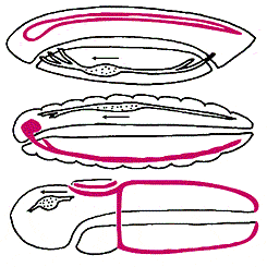 Сопоставление схем организации животных разных типов (сверху вниз): хордовых (ланцетника), членистоногих и полухордовых. Передний конец тела всюду обращен влево, спинная сторона - кверху. Центральная нервная система выделена цветом, направление кровотока показано стрелкой рядом с сердцем. Жоффруа Сент-Илер отмечал обратное, по сравнению с беспозвоночными, расположение нервной системы и сердца у хордовых. Но расположение нервной системы - критерий недостаточно убедительный: у беспозвоночных может быть несколько продольных нервных стволов, причем не только на брюшной стороне, но также по бокам и вдоль спины. Например, у представителей класса кишечнодышащих из типа полухордовых (ближайших родственников хордовых) два продольных нервных ствола: брюшной и спинной, причем спинной ствол у них частично свернут в трубку, точно так же, как у хордовых. Следовательно, можно предположить, что у предка хордовых было два нервных ствола, как у современных полухордовых, но затем брюшной ствол редуцировался и остался только спинной. И в этом случае гипотеза “перевернутости” не нужна. Расположение сердца - признак более надежный. Заметим, что направление кровотока у кольчатых червей, членистоногих, полухордовых и хордовых (если последних перевернуть) совпадает. Однако многие беспозвоночные лишены кровеносной системы, поэтому считается, что разное расположение сердца (снизу у хордовых и сверху у беспозвоночных) связано с независимым возникновением у них кровеносной системы. Среди других анатомических признаков, подтверждающих “перевернутость” хордовых, отметим лишь расположение печени: над средней кишкой у беспозвоночных и под - у хордовых [6].