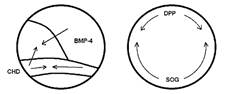 Расположение желтка (показано цветом) у зародышей лягушки (вверху) и дрозофилы. Передний конец тела обращен влево, спинная сторона - вверх. Кроме того, гипотеза “перевернутости” хордовых подтверждается в результате сравнения богатых желтком зародышей наземных членистоногих и таких позвоночных, как рыбы, земноводные, рептилии и птицы. У членистоногих желток всегда располагается на спинной стороне зародыша, а у позвоночных - всегда на брюшной [7]. Строение таких зародышей становится сопоставимым, только если признать гомологию спинной стороны позвоночных брюшной стороне беспозвоночных. Молекулярная биология развития В последние годы убедительные доказательства гипотезы “перевернутости” хордовых получены молекулярными биологами [8]. У зародышей позвоночных (лягушки и рыбы) на стадии гаструлы на спинной стороне синтезируется белок CHD (chordin), а на брюшной - белок BMP-4 (bone morphogenetic protein-4). У насекомых (дрозофилы) на стадии гаструлы на спинной стороне синтезируется белок DPP (decapentaplegic), а на брюшной - белок SOG (short gastrulation). Формирование структур и органов спинной и брюшной сторон тела у позвоночных и насекомых определяется соотношением концентраций упомянутых белков. Так, у зародыша лягушки в норме белок CHD синтезируется на спинной стороне, но если в опыте повысить его концентрацию на брюшной с помощью инъекции, необходимой для его синтеза матричной РНК, то на этом месте в дальнейшем разовьются структуры спинной стороны. Наоборот, искусственное повышение концентрации белка BMP-4 на спинной стороне зародыша вызывает развитие там структур брюшной стороны. Аналогичные результаты были получены и на дрозофиле: формирование структур спинной стороны связано с повышенной концентрацией белка DPP, а брюшной - SOG. Выяснилось также, что в белках CHD и SOG оказались одинаковыми 28% аминокислотных последовательностей, а из 100 аминокислот C-концевых частей молекул белков BMP-4 и DPP, отвечающих за их функционирование, совпадают 76%. Даже 28%-ая гомология сравниваемых белков свидетельствует о несомненном общем происхождении, от одного и того же белкового предка. Таким образом, “спинной” CHD позвоночных гомологичен “брюшному” SOG дрозофилы, а “брюшной” BMP-4 позвоночных гомологичен “спинному” DPP дрозофилы. Но ведь эти гомологии - не что иное, как подтверждение гипотезы “перевернутости” хордовых! Удивительна эволюционная консервативность функции рассматриваемых белков, которая проявляется в том, что белки лягушки CHD и BMP-4 функционально активны в зародыше дрозофилы, а белки дрозофилы SOG и DPP - в зародыше лягушки. Экспериментально показано, что “брюшной” белок лягушки BMP-4 вызывает у зародыша дрозофилы формирование структур спинной стороны, а “спинной” белок лягушки CHD приводит к формированию зародышем дрозофилы структур брюшной стороны. Наоборот, белки дрозофилы - “брюшной” SOG и “спинной” DPP - соответственно вызывают формирование зародышем лягушки структур спинной и брюшной сторон. А ведь, согласно современным оценкам, с момента расхождения эволюционных линий, ведущих к насекомым и хордовым, прошло более полумиллиарда лет! Такая консервативность белков делает гипотезу “перевернутости” хордовых еще более правдоподобной.