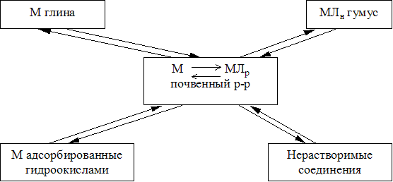 Рис. 1 На рисунке Лр – растворимые лиганды, какими являются органические кислоты с малым молекулярным весом, а Лн – нерастворимые. Реакция металлов (М) с гумусовыми веществами включает частично и ионный обмен. Конечно, в почве могут присутствовать и другие формы металлов, которые не участвуют непосредственно в этом равновесии, например, металлы из кристаллической решетки первичных и вторичных минералов, а также металлы из живых организмов и их отмерших остатков. Наблюдение за изменением тяжелых металлов в почве невозможно без знания факторов, определяющих их подвижность. Процессы передвижения удержания, обуславливающие поведение тяжелых металлов в почве, мало чем отличаются от процессов, определяющих поведение других катионов. Хотя тяжелые металлы иногда обнаруживаются в почвах в низких концентрациях, они формируют устойчивые комплексы с органическими соединениями и вступают в специфические реакции адсорбции легче, чем щелочные и щелочноземельные металлы. Миграция тяжелых металлов в почвах может происходить с жидкостью и суспензией при помощи корней растений или почвенных микроорганизмов. Миграции растворимых соединений происходит вместе с почвенным раствором (диффузия) или путем перемещения самой жидкости. Вымывание глин и органического вещества приводит к миграции всех связанных с ними металлов. Миграция летучих веществ в газообразной форме, например, диметила ртути, носит случайный характер, и этот способ перемещения не имеет особого значения. Миграция в твердой фазе и проникновение в кристаллическую решетку являются больше механизмом связывания, чем перемещения. Тяжелые металлы могут быть внесены или адсорбированы микроорганизмами, которые в свою очередь, способны участвовать в миграции соответствующих металлов. Дождевые черви и другие организмы могут содействовать миграции тяжелых металлов механическим или биологическим путями, перемешивая почву или включая металлы в свои ткани. Из всех видов миграции самая важная – миграция в жидкой фазе, потому что большинство металлов попадает в почву в растворимом виде или в виде водной суспензии и фактически все взаимодействия между тяжелыми металлами и жидкими составными частями почвы происходит на границе жидкой и твердой фаз. Тяжелые металлы в почве через трофическую цепь поступают в растения, а затем потребляются животными и человеком. В круговороте тяжелых металлов участвуют различные биологические барьеры, вследствие чего происходит выборочное бионакопление, защищающее живые организмы от избытка этих элементов. Все же деятельность биологических барьеров ограничена, и чаще всего тяжелые металлы концентрируются в почве. Устойчивость почв к загрязнению ими различна в зависимости от буферности. Почвы с высокой адсорбционной способностью соответственно и высоким содержанием глин, а также органического вещества могут удерживать эти элементы, особенно в верхних горизонтах. Это характерно для карбонатных почв и почв с нейтральной реакцией. В этих почвах количество токсических соединений, которые могут быть вымыты в грунтовые воды и поглощены растениями, значительно меньше, чем в песчаных кислых почвах. Однако при этом существует большой риск в увеличении концентрации элементов до токсичной, что вызывает нарушение равновесия физических, хими