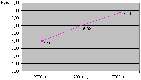 Наблюдается повышение среднегодовой стоимости основных средств предприятия в 2001 году по сравнению с 2000 годом на 10034713 рублей, но, несмотря на это, заметно увеличение фондоотдачи на 2,04 рубля, т.е. на 51,5%. Увеличение среднегодовой стоимости основных производственных фондов в 2002 году по сравнению с 2001 годом на 20686372 руб. не привело к снижению фондоотдачи. Она увеличилась по сравнению с предшествующим годом на 1,69 рубля. В общем в 2002 году по сравнению с 2000 годом произошло увеличение среднегодовой стоимости основных фондов на 30721085 руб., а также увеличение фондоотдачи на 3,73 рубля. На рисунке приведем пример изменения фондоотдачи за 2000-2002 гг.